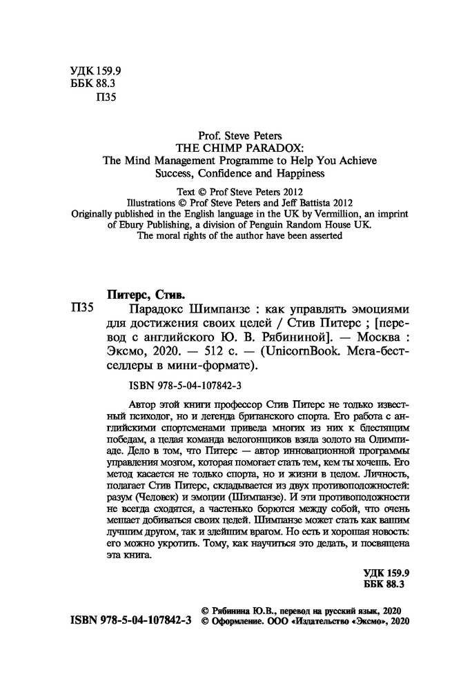 💳 Оплатить за товар можно при получении 🇰🇿 Есть бесплатная доставка по Казахстану 🎁 Копите бонусы с каждой покупки Серия: UnicornBook. Мега-бестселлеры в мини-формате Автор этой книги профессор Стив Питерс — не только известный психолог, но и легенда британского спорта. Его работа с английскими спортсменами привела многих из них к блестящим победам, а целая команда велогонщиков взяла золото на Олимпиаде. Дело в том, что Питерс — автор инновационной программы управления мозгом, которая помогает стать тем, кем ты хочешь. Его метод касается не только спорта, но и жизни в целом. Личность, полагает Стив Питерс, складывается из двух противоположностей: разум (Человек) и эмоции (Шимпанзе). И эти противоположности не всегда сходятся, а частенько борются между собой, что очень мешает добиваться своих целей. Шимпанзе может стать как вашим лучшим другом, так и злейшим врагом. Но есть и хорошая новость: его можно укротить. Тому, как научиться это делать, и посвящена эта книга. |