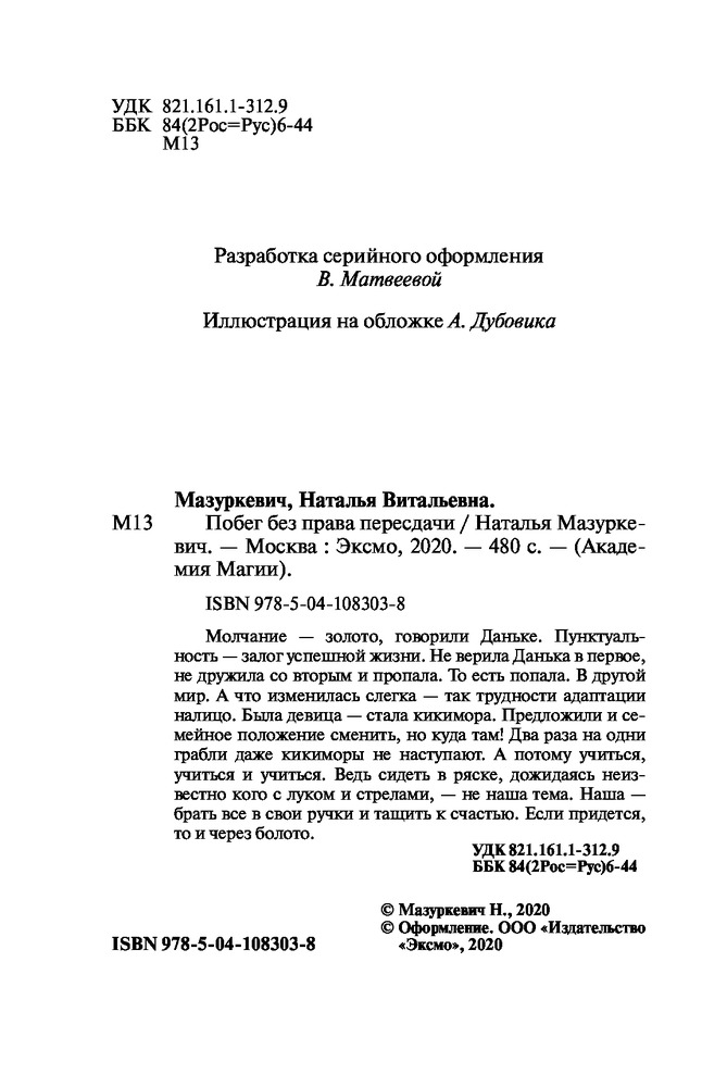Побег без права пересдачиВ данный момент этот товар отсутствует в продаже. Возможно, у нас найдется аналогичный или похожий товар здесь. Серия: Академия Магии (обложка) Молчание — золото, говорили Даньке. Пунктуальность — залог успешной жизни. Не верила Данька в первое, не дружила со вторым и пропала. То есть попала. В другой мир. А что изменилась слегка — так трудности адаптации на лицо. Была девица — стала кикимора. Предложили и семейное положение сменить, но куда там! Два раза на одни грабли даже кикиморы не наступают. А потому учиться, учиться и учиться. Ведь сидеть в ряске, дожидаясь неизвестно кого с луком и стрелами — не наша тема. Наша — брать все в свои ручки и тащить к счастью. Если придется, то и через болото. |
