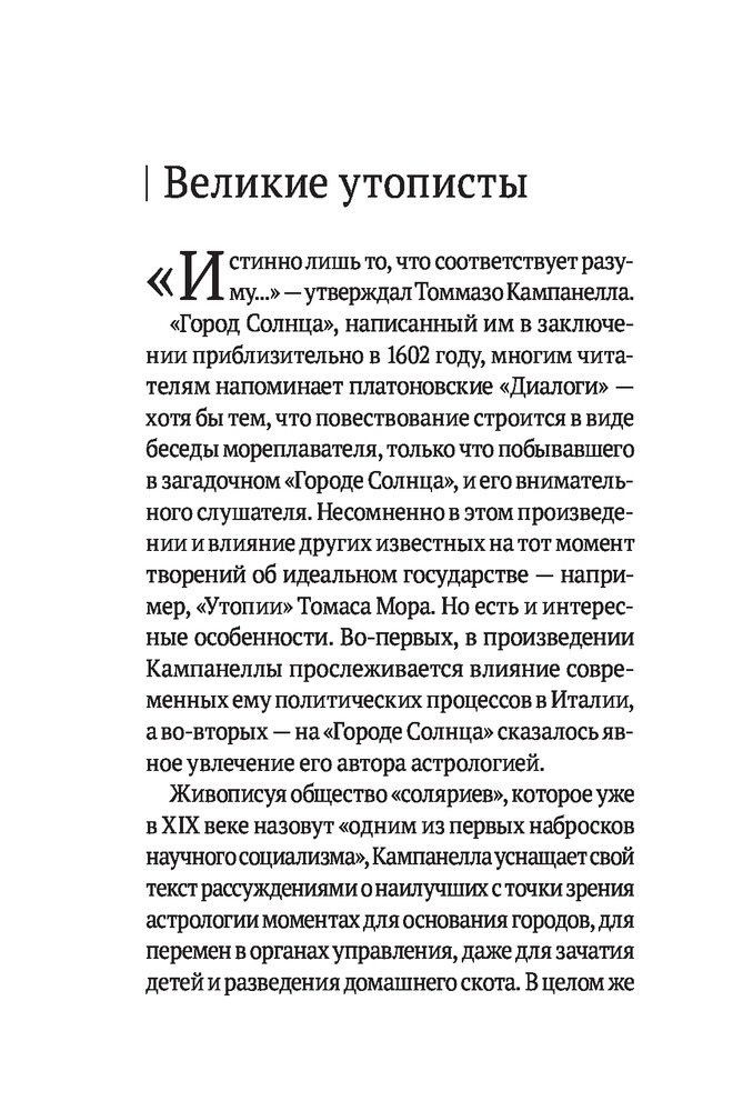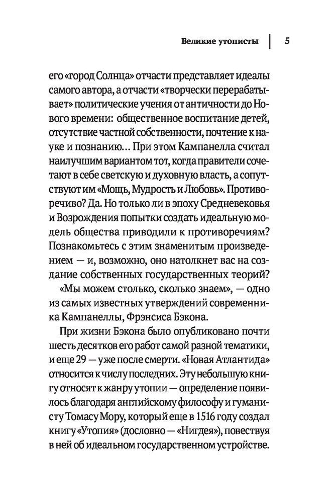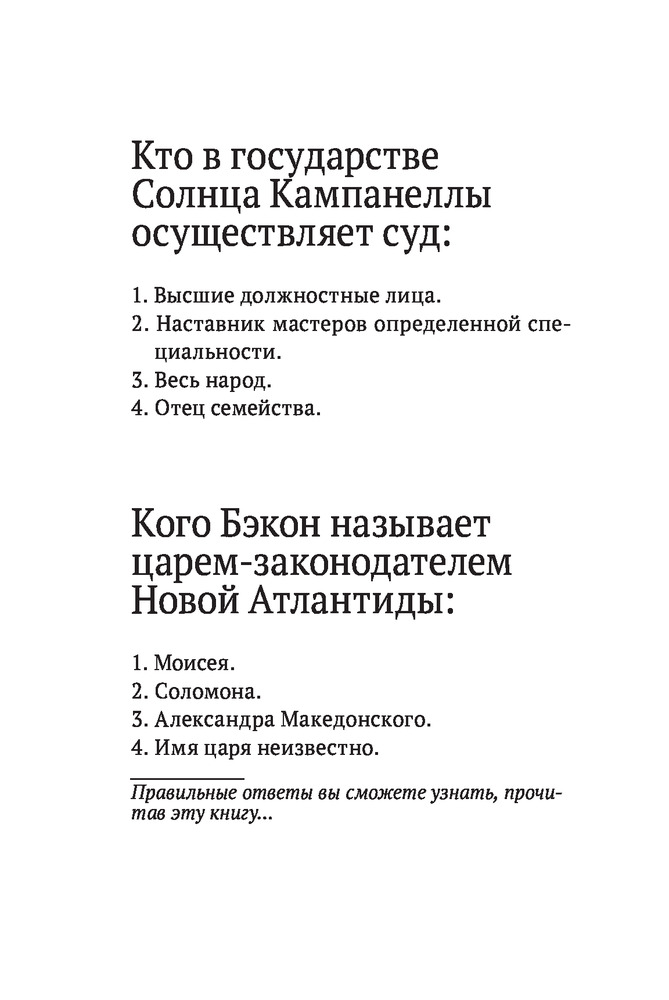 Кампанелла и БэконТоммазо Кампанелла, Фрэнсис Бэкон В данный момент этот товар отсутствует в продаже. Возможно, у нас найдется аналогичный или похожий товар здесь. Серия: Великие идеи (обложка) Человечество всегда мечтало об идеальном государстве — справедливом, богатом, управляемом мудрецами, пользующимися непререкаемым авторитетом, способным защитить себя от любых врагов... или попросту скрыть свою жизнь от посторонних глаз? Томмазо Кампанелла и Фрэнсис Бэкон — современники, но, казалось бы, совсем разные люди. Один — монах-бунтарь, другой — государственный деятель и ученый. Однако оба создали, пускай лишь только на бумаге, свои идеальные государства — Город Солнца и Новую Атлантиду, существующие тайно от прочей цивилизации, еще не достигшей их уровня. Оба автора населили эти государства носителями своих идей, своих представлений о том, какими должны быть власть, общество и человек. Приобщимся же и мы к этой пускай фантастической, но удивительной альтернативной реальности |