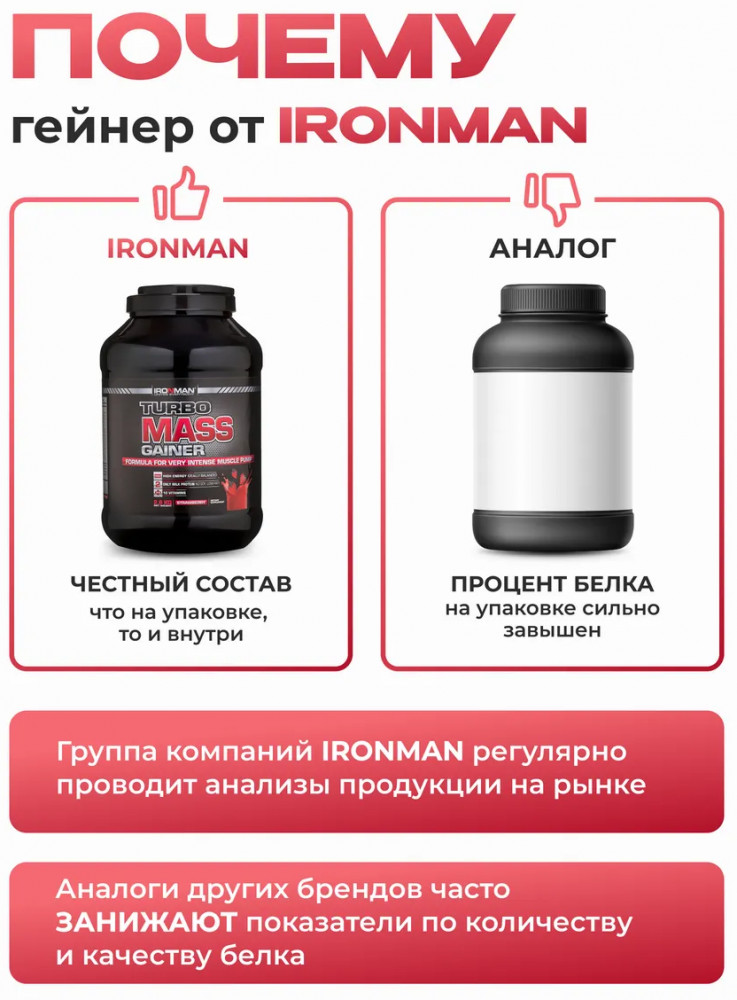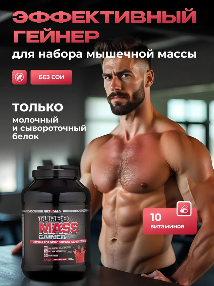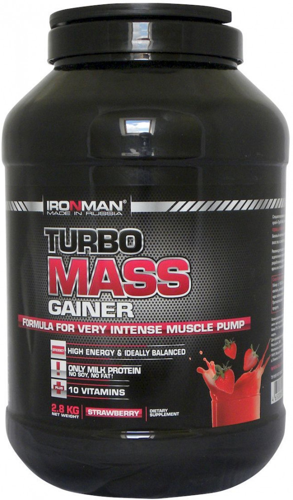 Гейнер Ironman «Турбо Масс» — это базовый гейнер для наращивания мышечной массы. Мощная многокомпонентная смесь, основанная на сывороточном белке, концентрате протеина и углеводной матрице без сои в составе, дополнительно обогащена 10 витаминами. Углеводная основа продукта — это моно-, ди- и олигосахариды, а белковая матрица основана исключительно на молочном и сывороточном белках, взятых в специальном соотношении. Гейнер обеспечит индивидуальную дозировку питательных веществ для эффективного набора массы. Продукт поможет восстановиться после тренировки и увеличит силу ваших мышц. Лучший выбор для спортсменов и людей, которые заботятся о своем здоровье. Каждая порция содержит мальтодекстрин и натуральный сухой сахар, которые поддерживают необходимый для интенсивных тренировок уровень употребления калорий. Гейнеры подходят для профессионального спортсмена и любителя фитнеса. Продукт предназначен для увеличения мышечной массы и не подходит для периода похудения или сушки тела, как для мужчин так и для женщин/