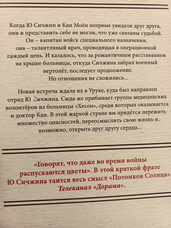 Потомки солнца супер! Я смотрела дораму! Книга просто отрывок фильма, я расстроилась.