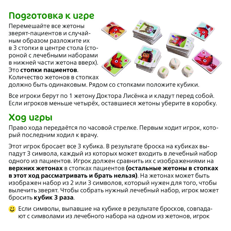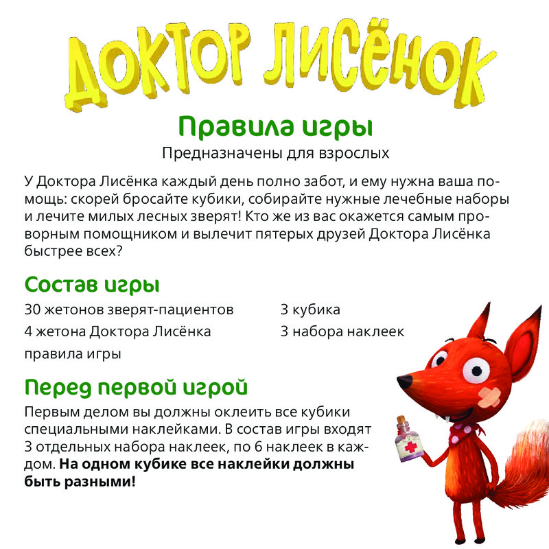 Hobby World Игра настольная «Доктор Лисёнок»В данный момент этот товар отсутствует в продаже. Возможно, у нас найдется аналогичный или похожий товар здесь. У Доктора Лисёнка каждый день полно забот, и ему нужна ваша помощь: скорей бросайте кубики и лечите милых лесных зверят! Помогать Доктору Лисёнку легко и весело — правила этой игры доступны для самых маленьких ветеринаров, а возможность испытать свою удачу делает игру одинаково увлекательной для всей семьи. |