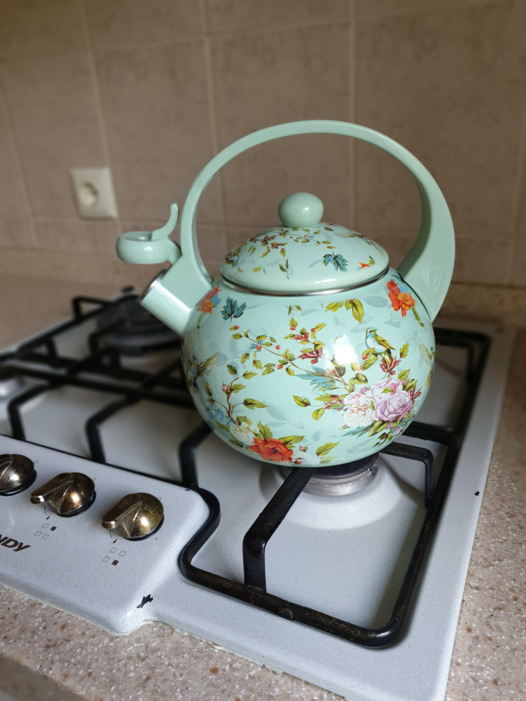 Расцветка чайника очень красочная! Брала к бирюзовой кухне, а он ближе к зеленому цвету. Размер подходящий. Ручка удобная, сделана качественно, не нагревается. Носик у чайника широкий, заглушка свистка прилегает плотно. Отлично моется и внутри и снаружи. Правда у свистка звук слабый, вне кухни не слышно. Из-за упаковки смело можно брать на подарок- отлично дойдет без повреждений.