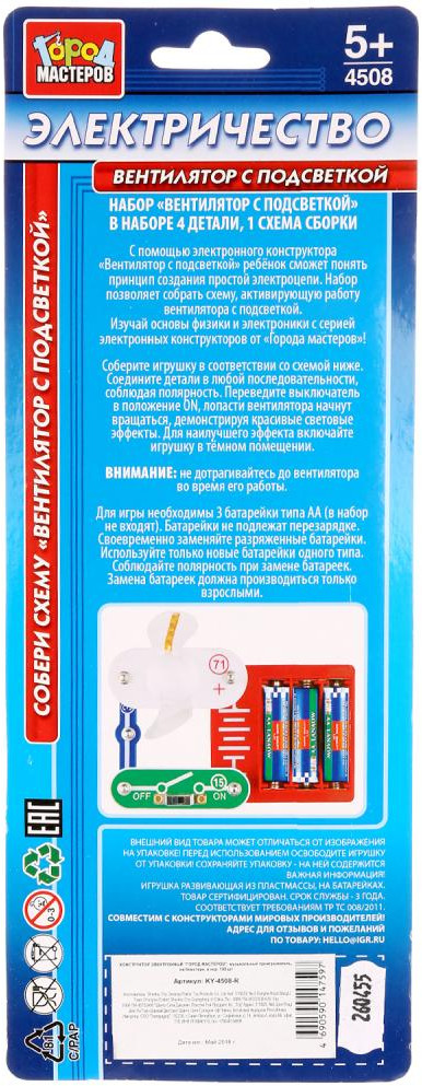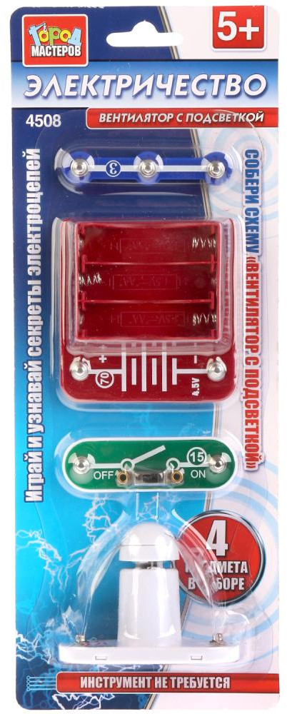 Город мастеров Конструктор электронный «Вентилятор с подсветкой»В данный момент этот товар отсутствует в продаже. Возможно, у нас найдется аналогичный или похожий товар здесь. Серия: Электричество Электронный конструктор — это уникально новая разработка ТМ «Город мастеров». В набор входят детали, собрав которые, ребёнок поймёт схему работы электричества и запустит светодиодный пропеллер. Конструктор отличается оригинальным способом соединения деталей. В комплекте прилагается 8 схем по сборке. Развивает кругозор, логическое мышление, прививает интерес к науке. |