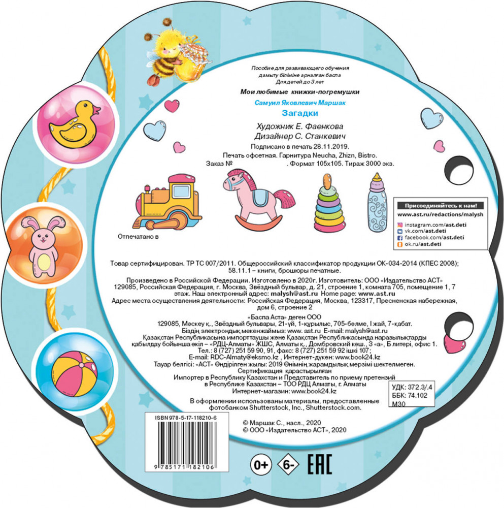 💳 Оплатить за товар можно при получении 🇰🇿 Есть бесплатная доставка по Казахстану 🎁 Копите бонусы с каждой покупки Серия: Мои любимые книжки-погремушки Все дети любят играть и отгадывать Загадки. Все дети любят стихи. В этом небольшом сборнике вы найдете самые интересные стихи-загадки детского классика С.Я. Маршака, дополненные яркими иллюстрациями-подсказками известной художницы Е.Фаенковой. |