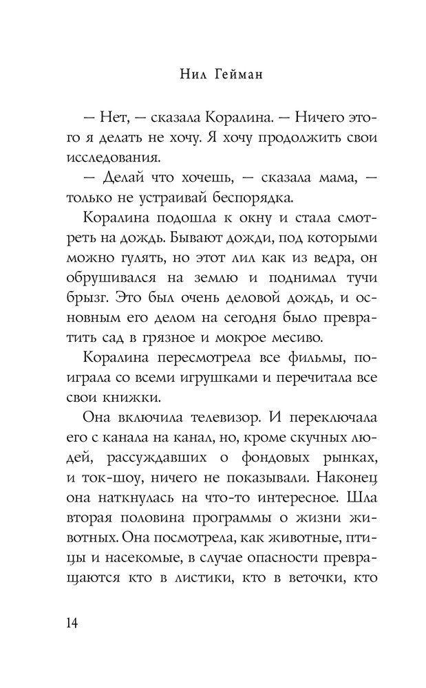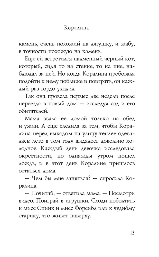 КоралинаВ данный момент этот товар отсутствует в продаже. Возможно, у нас найдется аналогичный или похожий товар здесь. Серия: Шедевры магического реализма Что делать, если ты переехала в новый дом, до школы еще целая неделя, на улице дождь и туман, а родители вечно заняты? Разумеется, исследовать! Так юная Коралина знакомится с весьма странными соседями и в высшей степени независимым черным котом, а потом обнаруживает запертую дверь, ведущую в... никуда? Как бы не так! За этой дверью — целый мир! Мир, в котором все точно так же — и совершенно по-другому. Мир, в котором тебя ждут вкусная еда и красивая одежда, но главное — другие мама и папа: точно такие же, но более внимательные и заботливые. Только кожа их тонка и бела, как бумага. Только пальцы их чересчур длинные и нервные, а вместо глаз у них — круглые пуговицы. Только слишком уж жутко от одной мысли остаться с ними навсегда... |