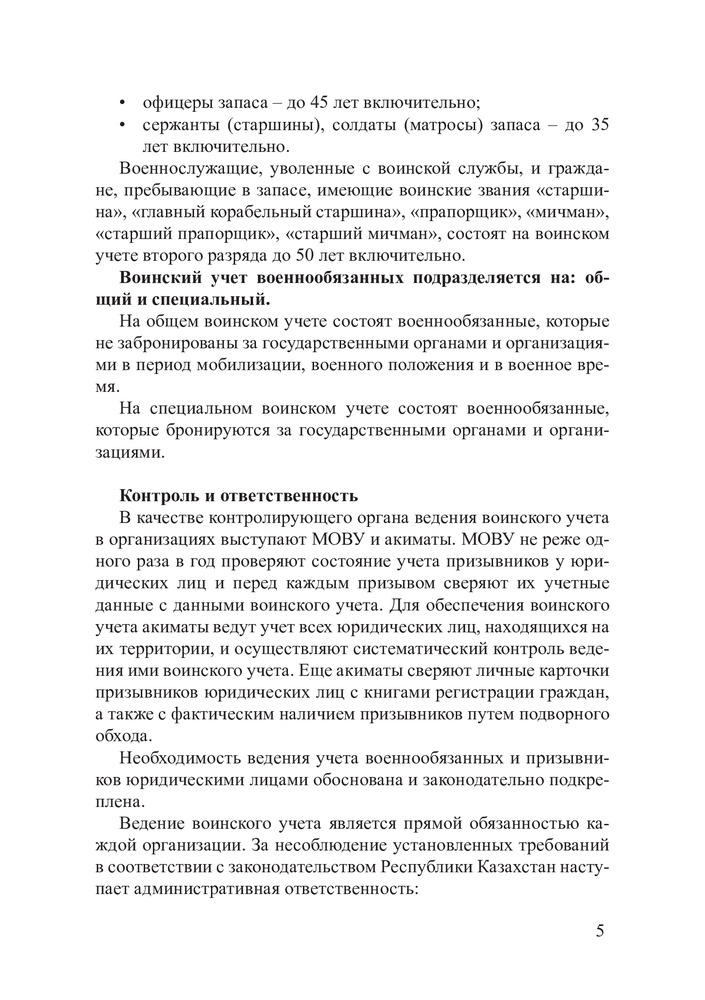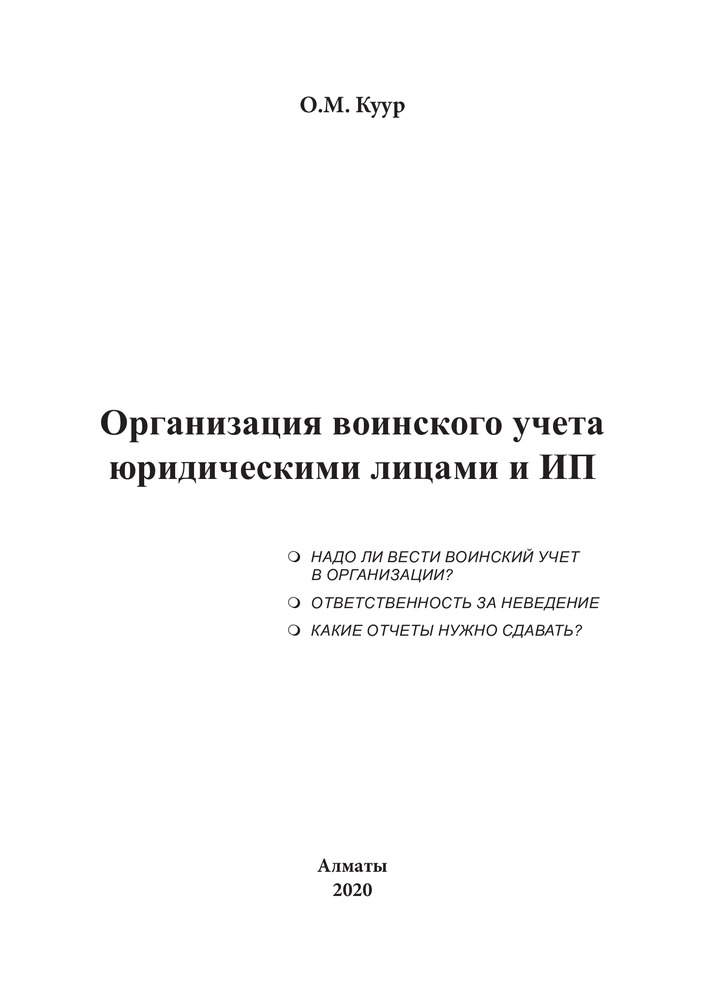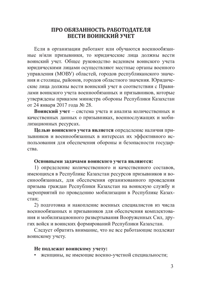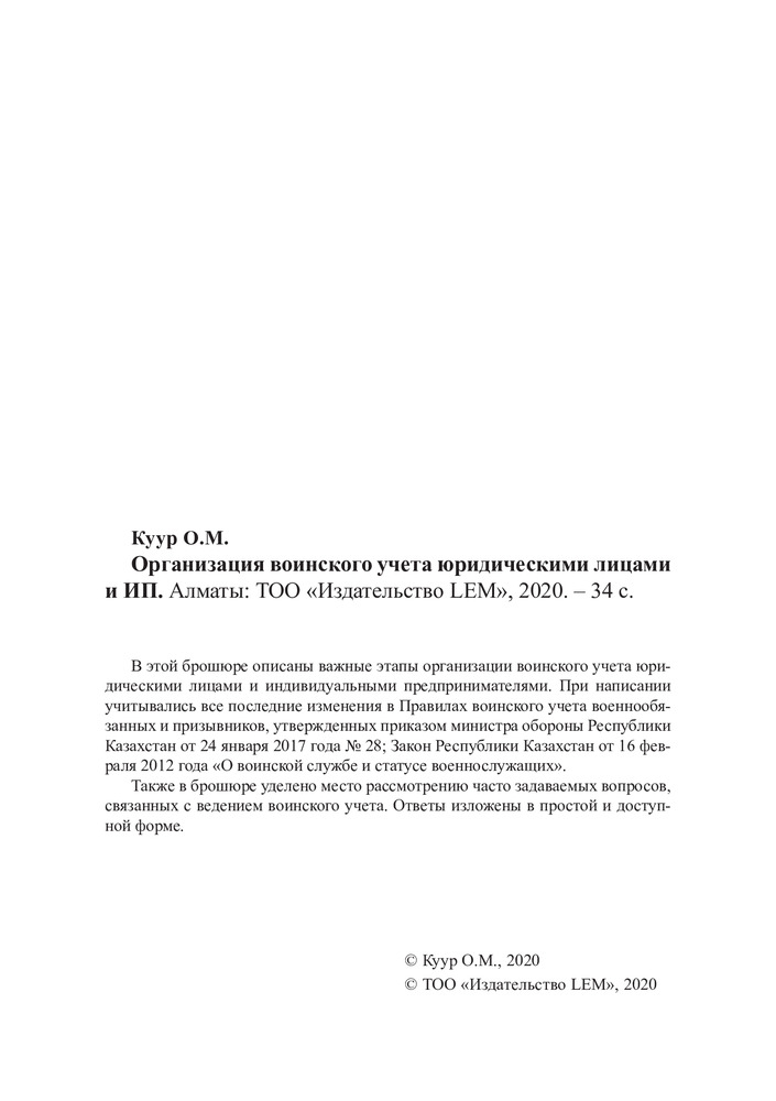 💳 Оплатить за товар можно при получении 🇰🇿 Есть бесплатная доставка по Казахстану от 1 дня 🎁 Копите бонусы с каждой покупки В этой брошюре описаны важные этапы организации воинского учета юридическими лицами и индивидуальными предпринимателями. При написании учитывались все последние изменения в Правилах воинского учета военнообязанных и призывников, утвержденных приказом министра обороны Республики Казахстан от 24 января 2017 года № 28; Закон Республики Казахстан от 16 февраля 2012 года «О воинской службе и статусе военнослужащих». |