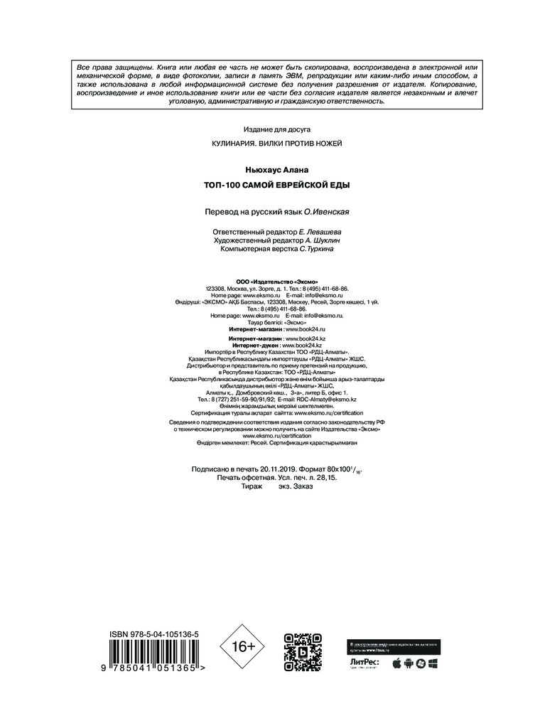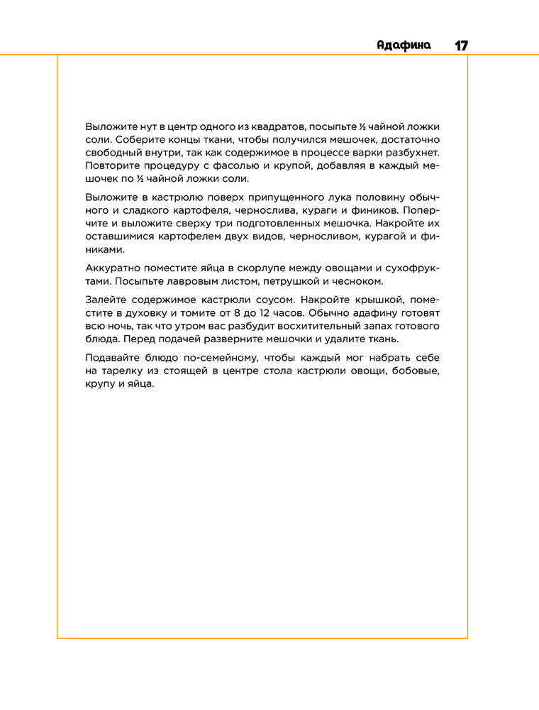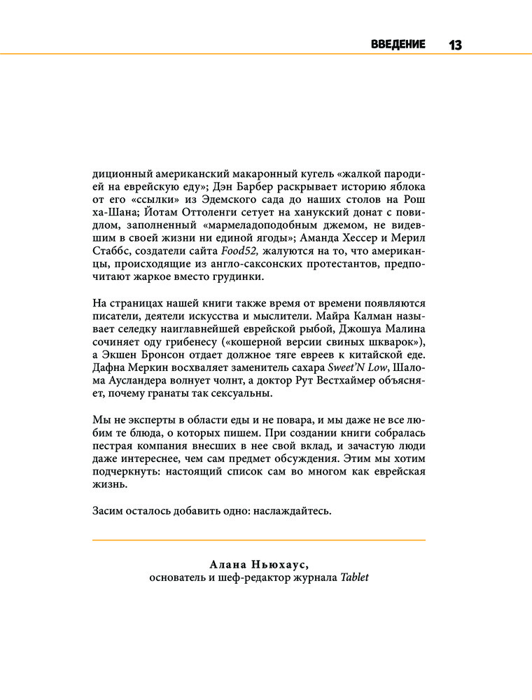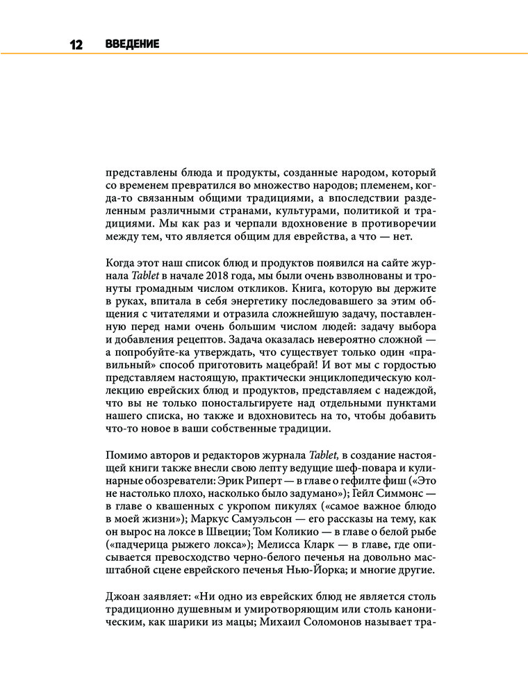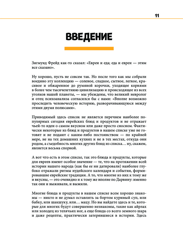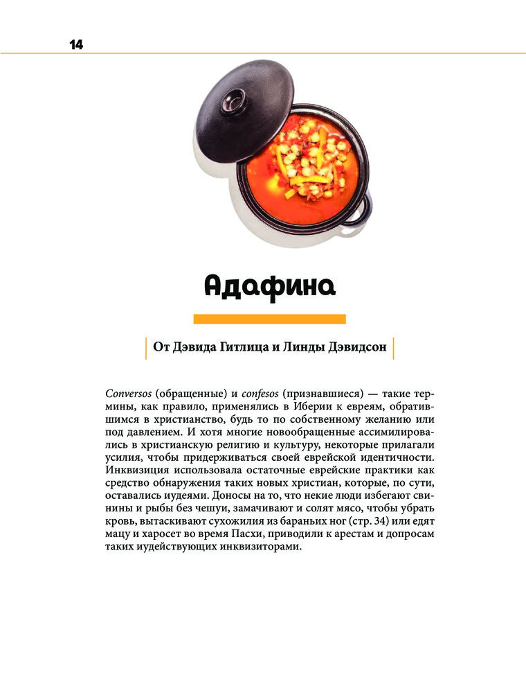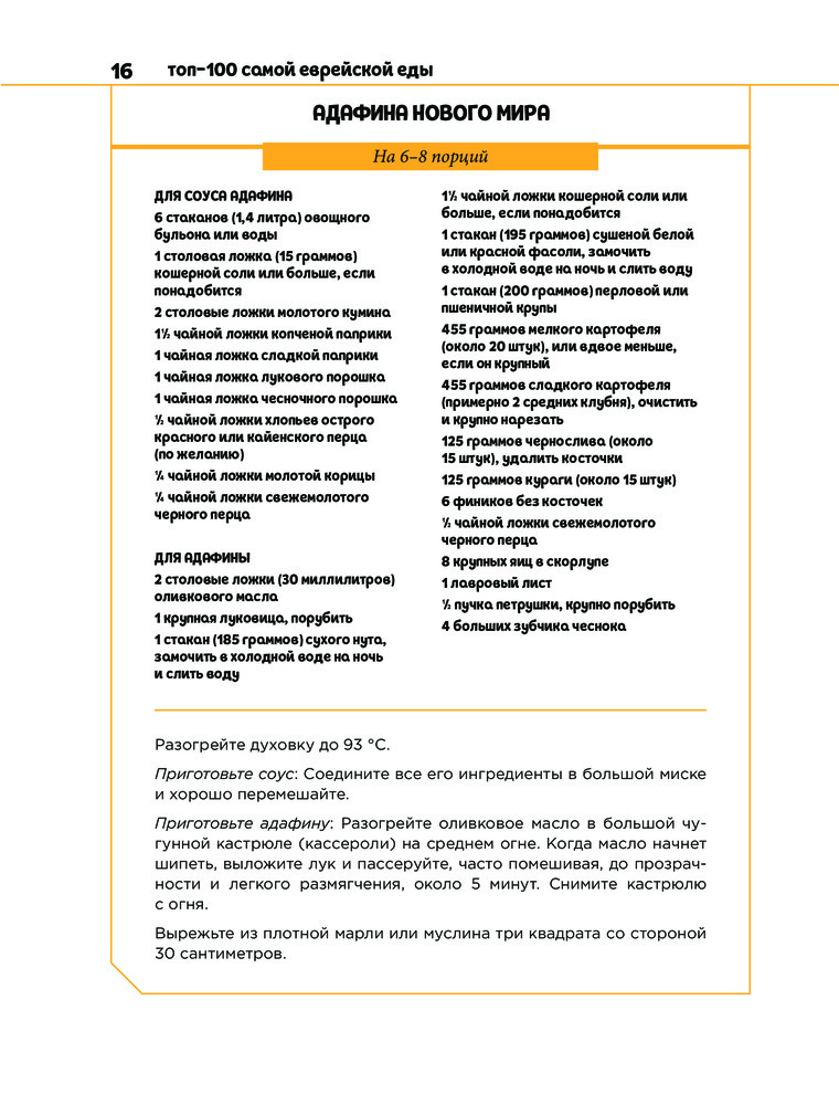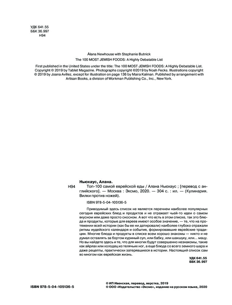 Серия: Кулинария. Вилки против ножей Приводимый здесь список не является перечнем наиболее популярных сегодня еврейских блюд и продуктов и не отражает чьей-то идеи о самом вкусном или даже просто сносном. А вот что есть в этом списке, так это блюда и продукты, которые для евреев имеют особое значение — те, что на протяжении всей истории (как бы ее ни датировали) наиболее глубоко отражали ритмы иудейского календаря и события, формировавшие еврейские традиции. Многие блюда и продукты в списке всем хорошо знакомы — никто и не думал оставлять за бортом куриный суп, или бабку, или шакшуку, или... мацу. Но вы найдете здесь и те, что для многих будут совершенно незнакомы, такие как айрлах или холодец из телячьих ног, а еще блюда со всего земного шара и даже рецепты, практически затерявшиеся в истории. Настоящий список сам во многом как еврейская жизнь. |