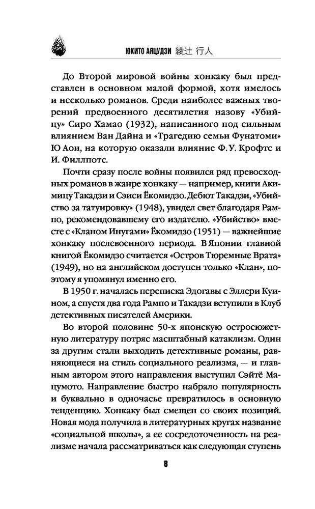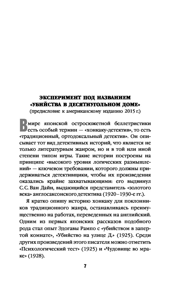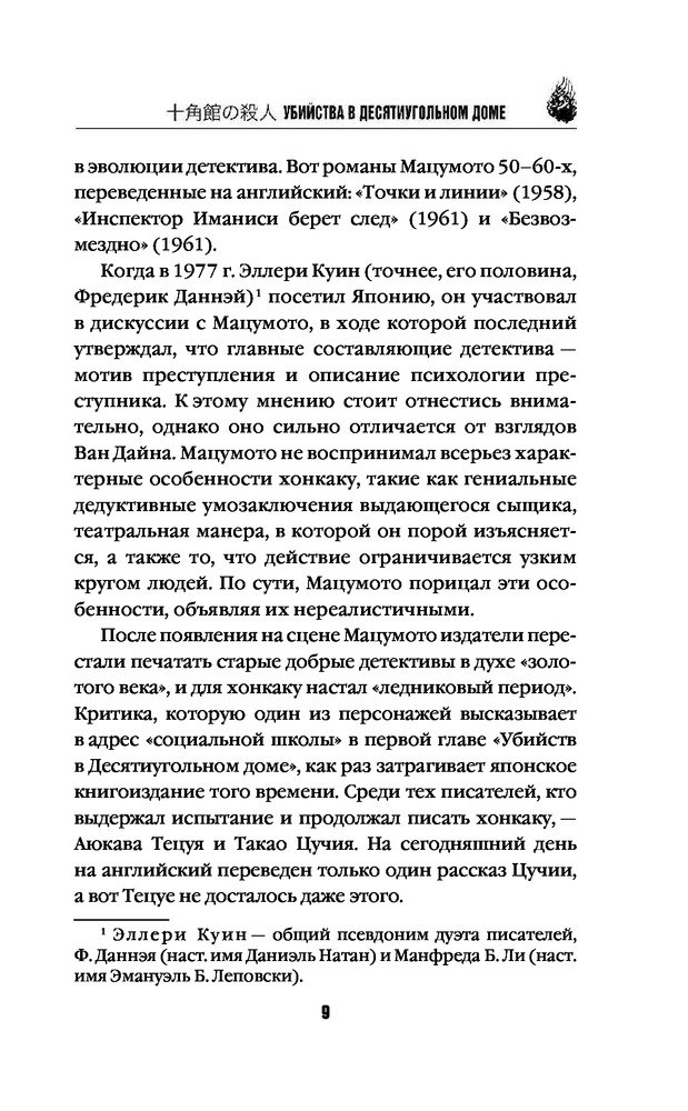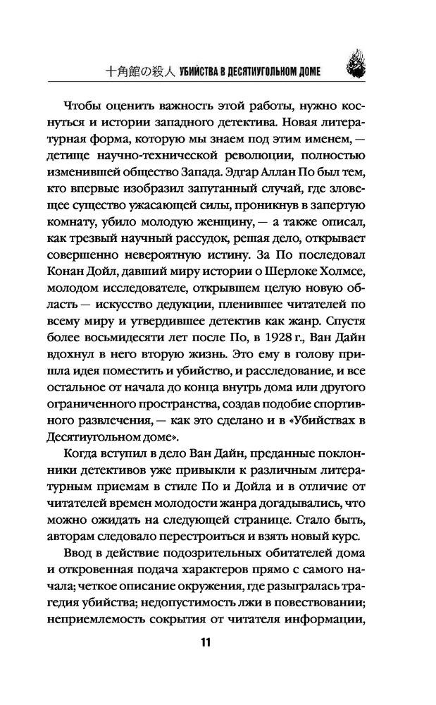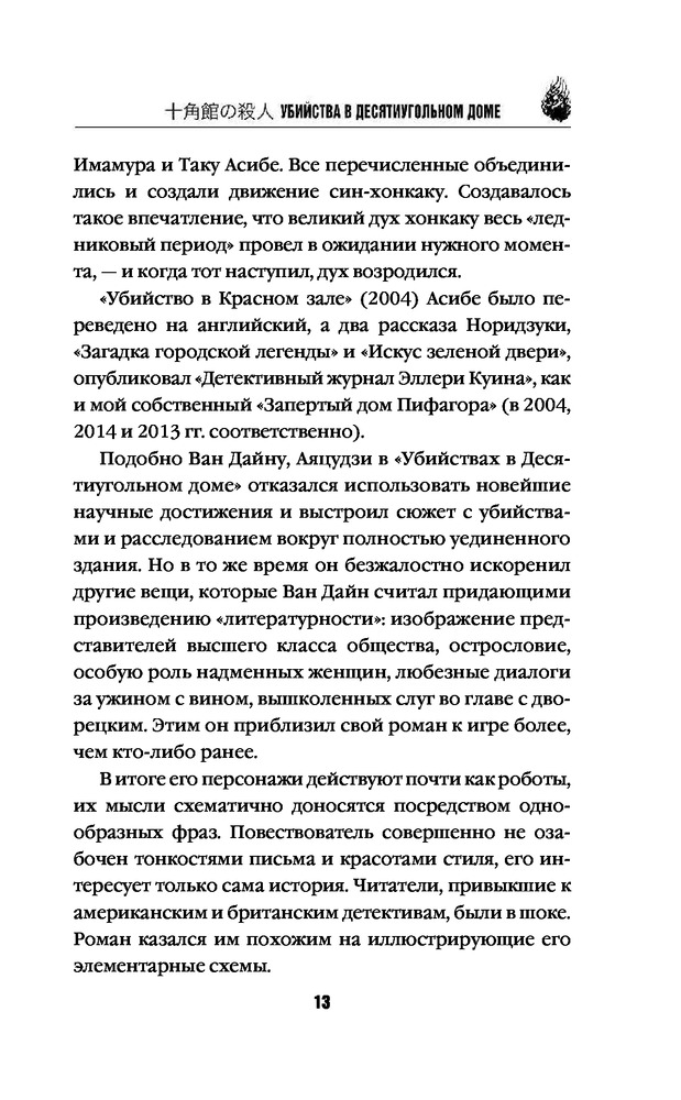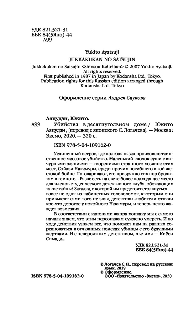 Убийства в десятиугольном домеВ данный момент этот товар отсутствует в продаже. Возможно, у нас найдется аналогичный или похожий товар здесь. Серия: Хонкаку-детектив Уединенный остров, где полгода назад произошло таинственное массовое убийство. Маленький клочок суши с вычурными зданиями — творениями странного хозяина этих мест, Сэйдзи Накамуры, среди прочих погибшего в той жестокой бойне. Поговаривают, его призрак до сих пор бродит там в темноте... Разве есть на свете более подходящее место для членов студенческого детективного клуба, обожающих такие тайны? Загадка, с которой им предстоит столкнуться, — вовсе не одна из кабинетных головоломок, к которым они привыкли: сами того не зная, детективы-любители отняли кое-что дорогое у покойного Накамуры, и теперь некто жаждет возмездия... |