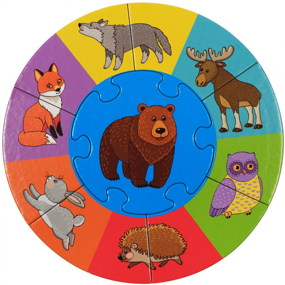 В этой коробочке собралось много интересных животных. Одни прибежали из леса, вторые пришли с фермы, третьи выплыли из моря, а четвёртые добрались из Африки. Нужно сложить каждое животное из двух половинок, определить, кто где живёт, и собрать пазлы в зависимости от места обитания животных.