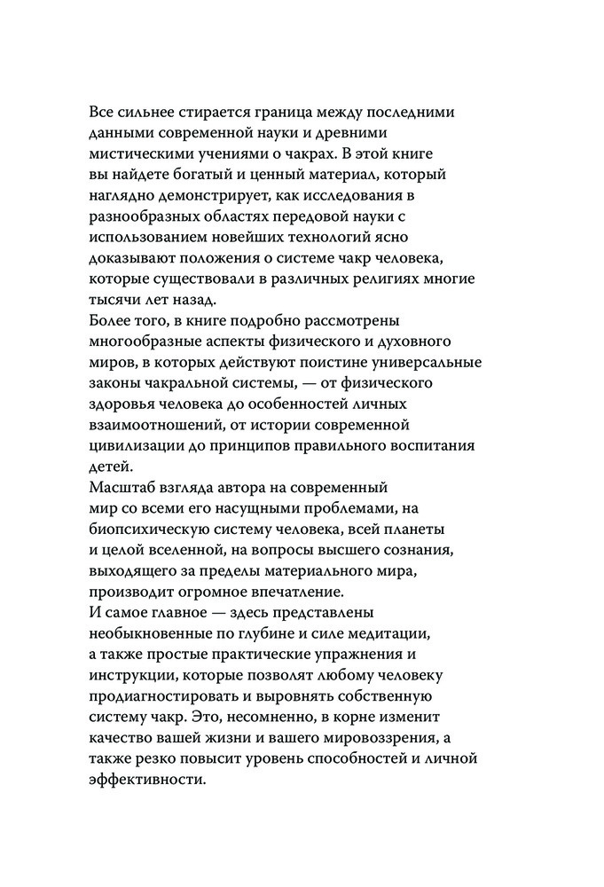 Прекрасная книга для начинающих. Легко и понятно читается. Всё, что нужно знать тем, кто решил разобраться в основах учений о чакрах. Отличная цена для такой качественной книги