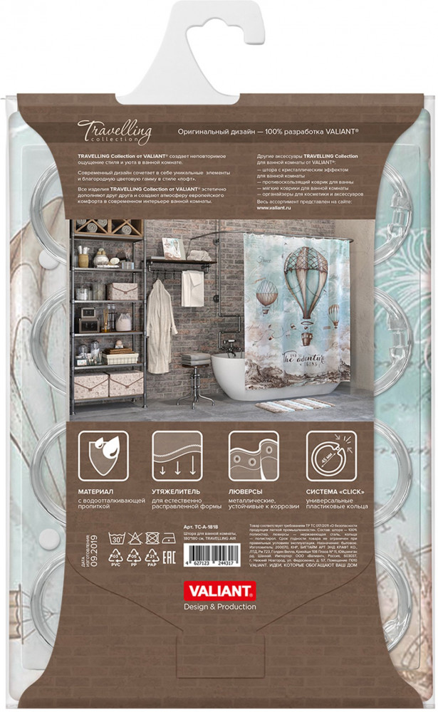 Valiant Штора для ваннойВ данный момент этот товар отсутствует в продаже. Возможно, у нас найдется аналогичный или похожий товар здесь. Серия: Travelling Air Штора не только защитит пол вашей ванной от брызг, но и станет оригинальным украшением интерьера. Элегантный дизайн создает утонченный дух французской провинции. Штора крепится на прозрачные пластиковые кольца (12 шт., внутренний диаметр 45 мм.). Кольца фиксируются замочком «Клик», чтобы их открыть, нужно нажать на край и сдвинуть, как показано в инструкции. Ни в коем случае нельзя с силой размыкать кольца, растягивая в разные стороны. |