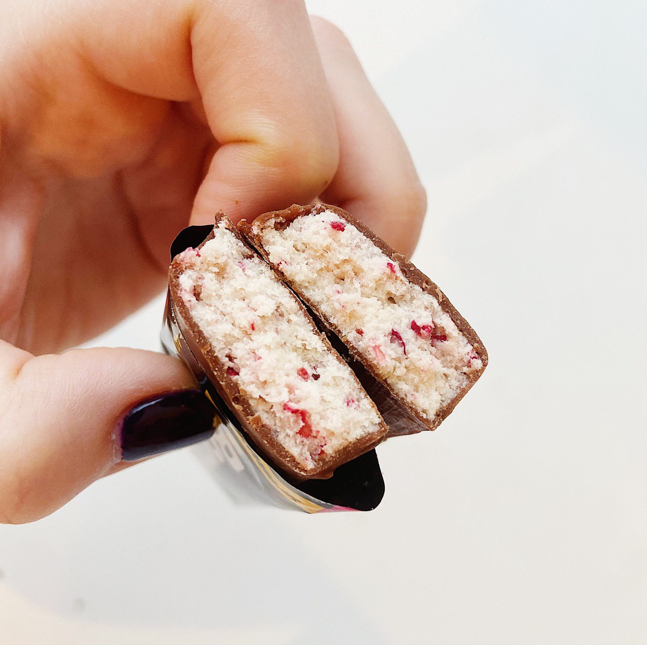 Вкусный батончик, но тягучий, прилипает к зубам и наличие малиновых косточек не понравилось.