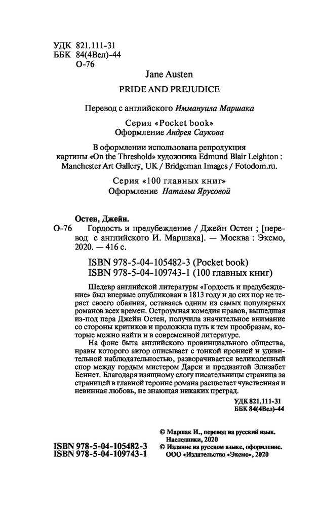 Гордость и предубеждениеВ данный момент этот товар отсутствует в продаже. Возможно, у нас найдется аналогичный или похожий товар здесь. Серия: 100 главных книг (обложка) Шедевр английской литературы «Гордость и предубеждение» был впервые опубликован в 1813 году и до сих пор не теряет своего обаяния, оставаясь одним из самых популярных романов всех времен. Остроумная комедия нравов, вышедшая из-под пера Джейн Остен, получила значительное внимание со стороны критиков и проложила путь к тем прообразам, которые можно найти и в современной литературе. На фоне быта английского провинциального общества, нравы которого автор описывает с тонкой иронией и удивительной наблюдательностью, разворачивается великолепный спор между гордым мистером Дарси и предвзятой Элизабет Беннет. Благодаря изящному слогу писательницы страница за страницей в главной героине романа расцветает чувственная и невинная любовь, не знающая никаких преград. |
