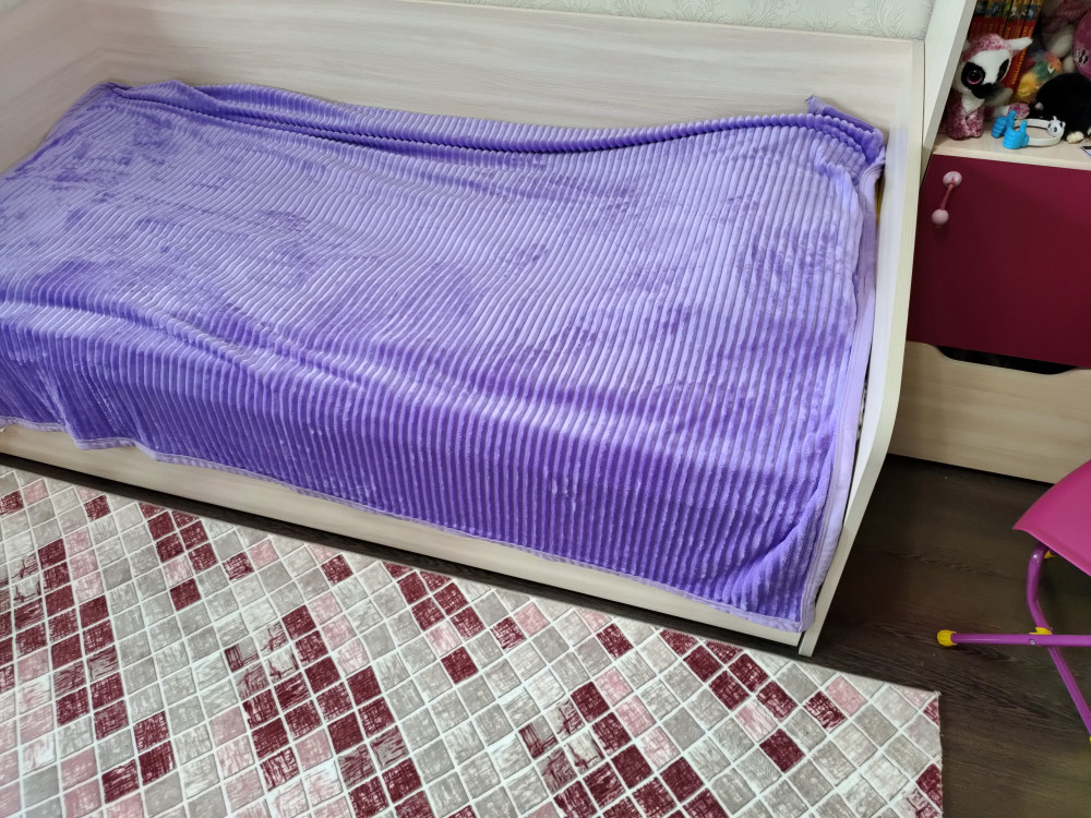 Мне понравился плед. Мягкий на ощупь, но при этом хорошо держит форму на кровати. Заказала для ребёнка жёлтого цвета. Дочь пищала от восторга когда увидела. На фото ярче, чем в реале.
