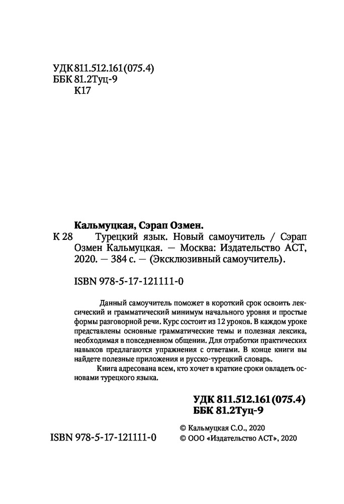 💳 Оплатить за товар можно при получении 🇰🇿 Есть бесплатная доставка по Казахстану от 1 дня 🎁 Копите бонусы с каждой покупки Серия: Эксклюзивный самоучитель Данный самоучитель поможет в короткий срок освоить лексический и грамматический минимум начального уровня и простые формы разговорной речи. Курс состоит из 12 уроков. В каждом уроке представлены основные грамматические темы и полезная лексика, необходимая в повседневном общении. Для отработки практических навыков предлагаются упражнения с ответами. В конце книги вы найдете полезные приложения и русско-турецкий словарь. Книга адресована всем, кто хочет в краткие сроки овладеть основами турецкого языка. |