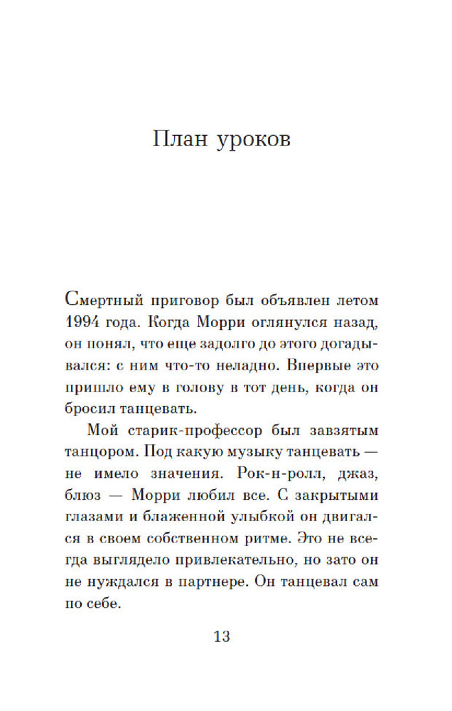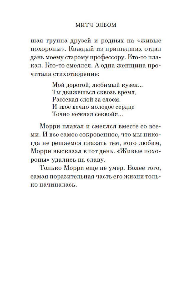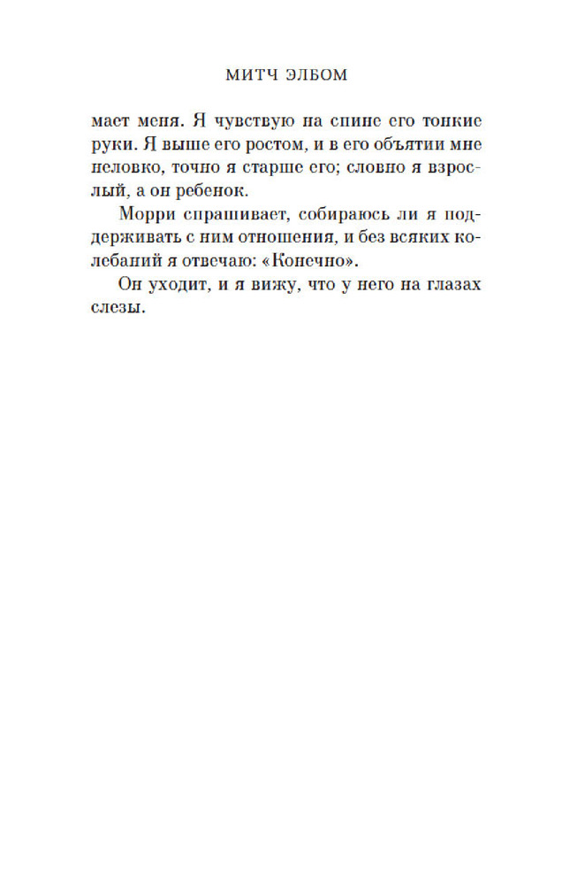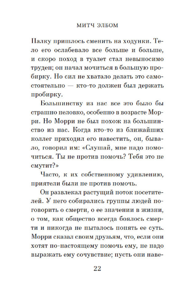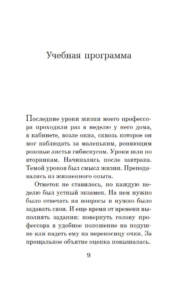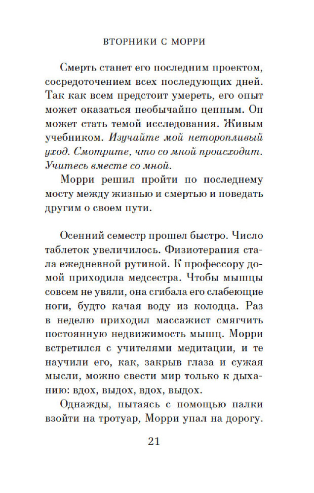 Это самая трогательная история из всех мною прочитанных. Каждая глава меня оставляла на определенное время размышлять и плакать. Понимать и сожалеть. Менять отрезки своих действий и приоритеты. Больше понимать, любить и прощать, чего мне очень не хватало. Когда вы запутались, устали, в депрессии - читайте эту книгу. Выделяйте полюбившиеся строки. Перечитаю издание не раз. Благодарю Автора, что поделился дружбой с Морри со всем миром.
