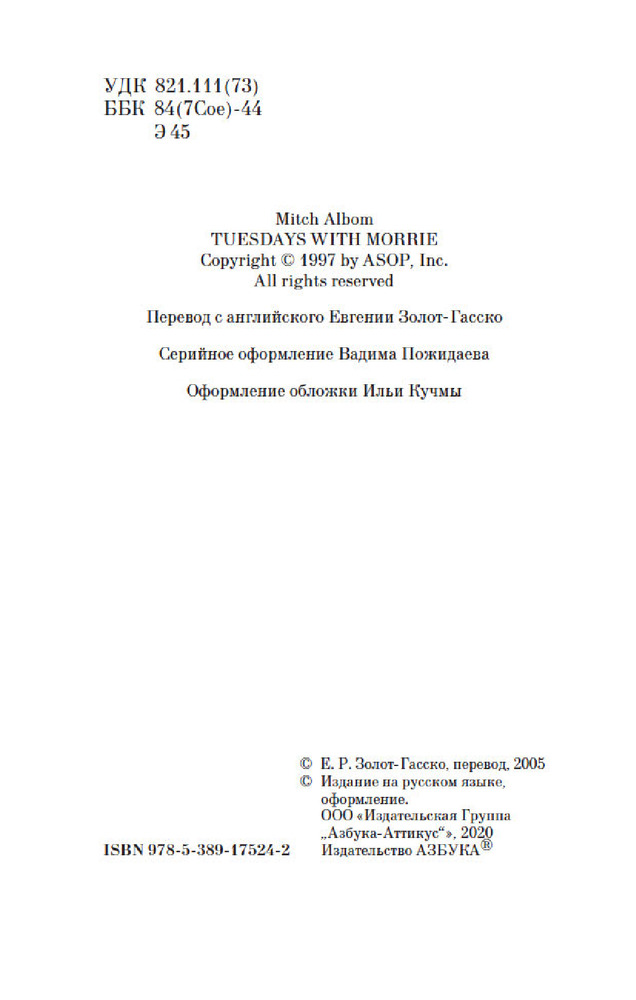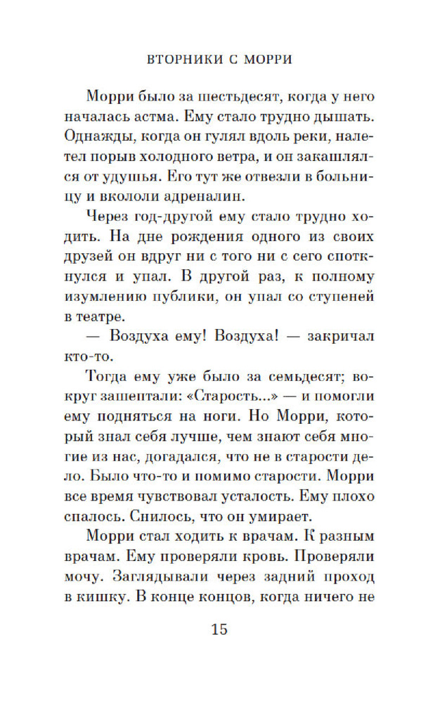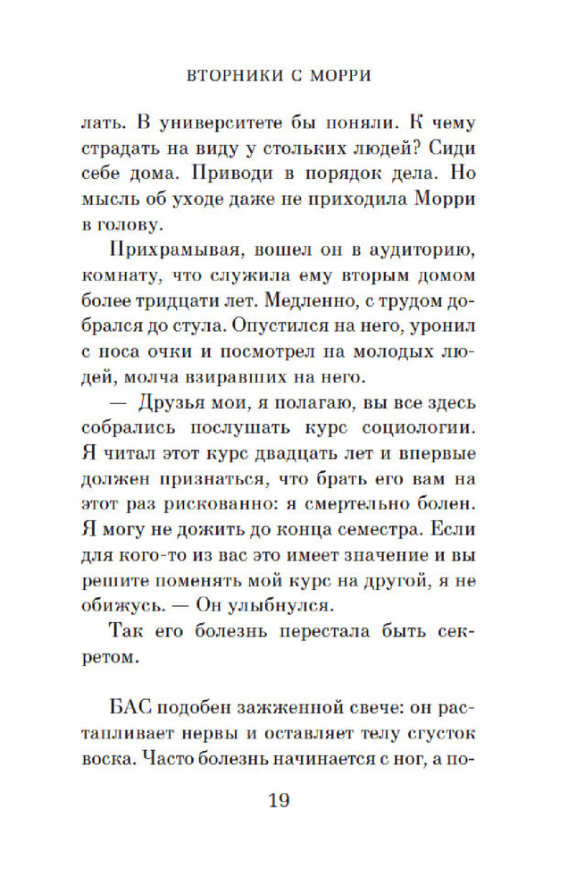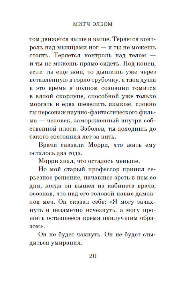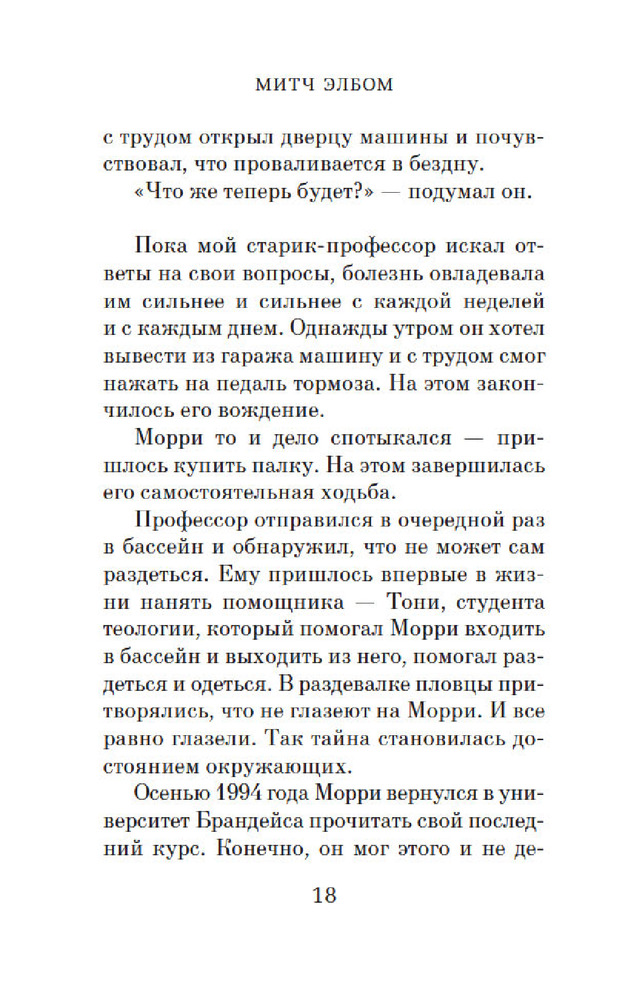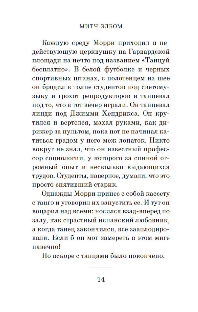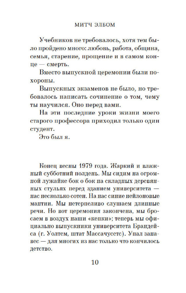 Это самая трогательная история из всех мною прочитанных. Каждая глава меня оставляла на определенное время размышлять и плакать. Понимать и сожалеть. Менять отрезки своих действий и приоритеты. Больше понимать, любить и прощать, чего мне очень не хватало. Когда вы запутались, устали, в депрессии - читайте эту книгу. Выделяйте полюбившиеся строки. Перечитаю издание не раз. Благодарю Автора, что поделился дружбой с Морри со всем миром.