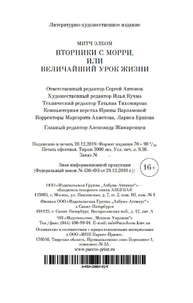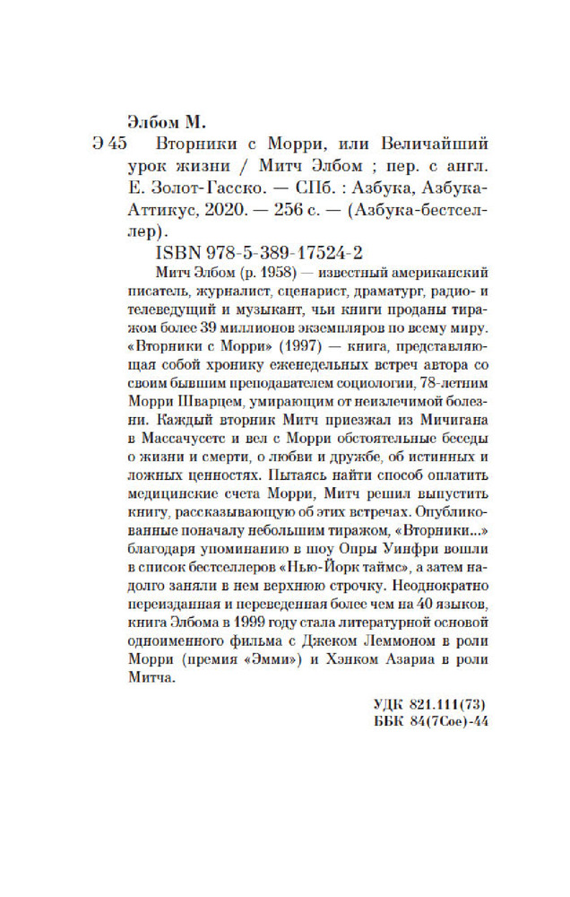 Вторники с Морри, или Величайший урок жизниВ данный момент этот товар отсутствует в продаже. Возможно, у нас найдется аналогичный или похожий товар здесь. Серия: Азбука-бестселлер Митч Элбом (р. 1958) — известный американский писатель, журналист, сценарист, драматург, радио- и телеведущий и музыкант, чьи книги проданы тиражом более 39 миллионов экземпляров по всему миру. «Вторники с Морри» (1997) — книга, представляющая собой хронику еженедельных встреч автора со своим бывшим преподавателем социологии, 78-летним Морри Шварцем, умирающим от неизлечимой болезни. Каждый вторник Митч приезжал из Мичигана в Массачусетс и вел с Морри обстоятельные беседы о жизни и смерти, о любви и дружбе, об истинных и ложных ценностях. Пытаясь найти способ оплатить медицинские счета Морри, Митч решил выпустить книгу, рассказывающую об этих встречах. Опубликованные поначалу небольшим тиражом, «Вторники...» благодаря упоминанию в шоу Опры Уинфри вошли в список бестселлеров «Нью-Йорк таймс», а затем надолго заняли в нем верхнюю строчку. Неоднократно переизданная и переведенная более чем на 40 языков, книга Элбома в 1999 году стала литературной основой одноименного фильма с Джеком Леммоном в роли Морри (премия «Эмми») и Хэнком Азариа в роли Митча. |