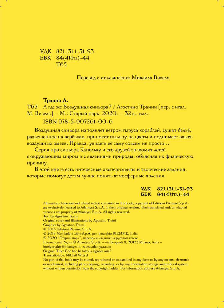 💳 Оплатить за товар можно при получении 🇰🇿 Есть бесплатная доставка по Казахстану 🎁 Копите бонусы с каждой покупки Серия: Синьор Капелька и его друзья Воздушная синьора наполняет ветром паруса кораблей, сушит белье, развешенное на веревках, приносит пыльцу на цветы и поднимает ввысь воздушных змеев. Правда увидеть ее саму совсем не просто... Воздушная синьора расскажет что такое невидимый воздух, почему ветер бывает разный и как с ним подружиться. |