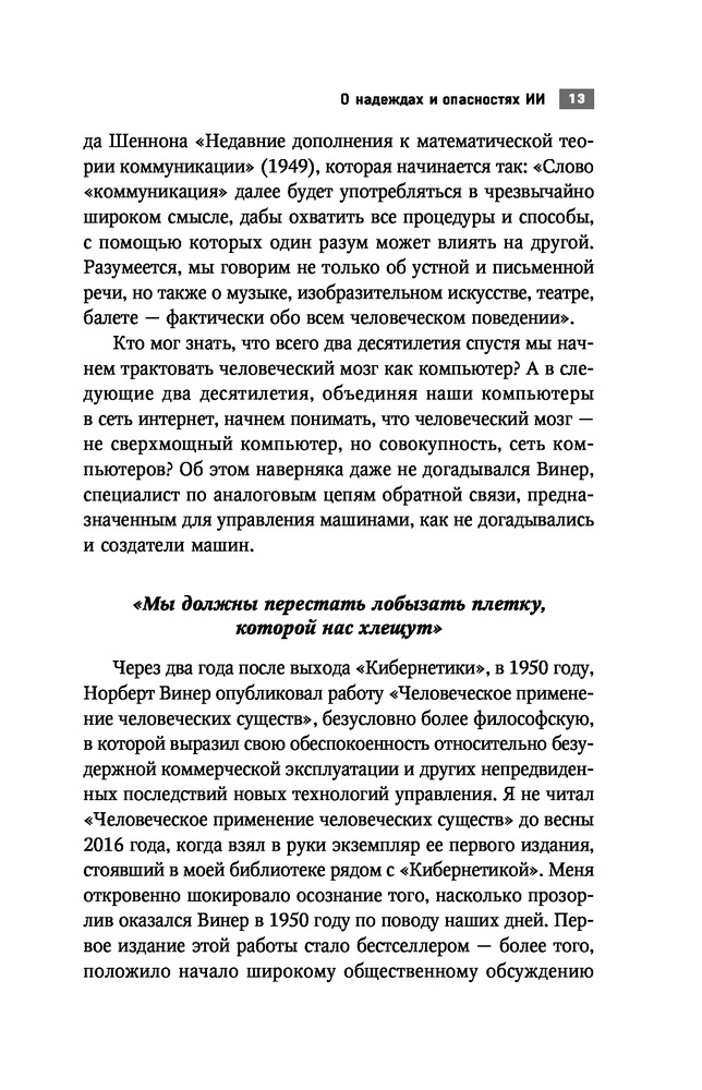 В данный момент этот товар отсутствует в продаже. Возможно, у нас найдется аналогичный или похожий товар здесь. Серия: Наука, идеи, ученые В далеком 1950-м году американский математик, отец-основатель кибернетики и теории искусственного интеллекта Норберт Винер опубликовал работу «Человеческое применение человеческих существ» (в русском переводе — «Кибернетика и общество»), в которой выразил свои опасения, связанные с развитием искусственного интеллекта.