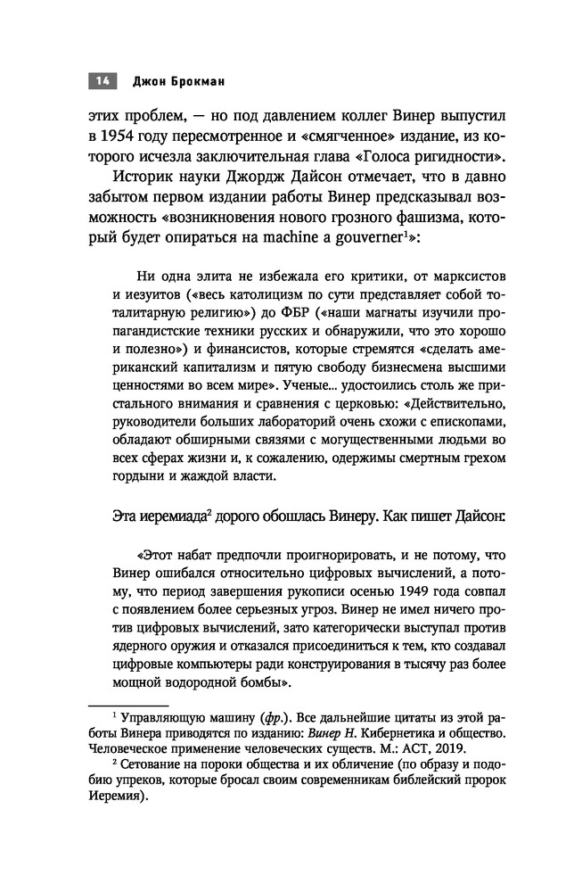 Руководствуясь формулой «кто предупрежден — тот вооружен», Джон Брокман предложил известным ученым, публицистам и философам поразмышлять о перспективах взаимодействия человека и искусственного интеллекта в свете идей, высказанных Винером, а также в свете новых реалий и последних достижений научной мысли. |