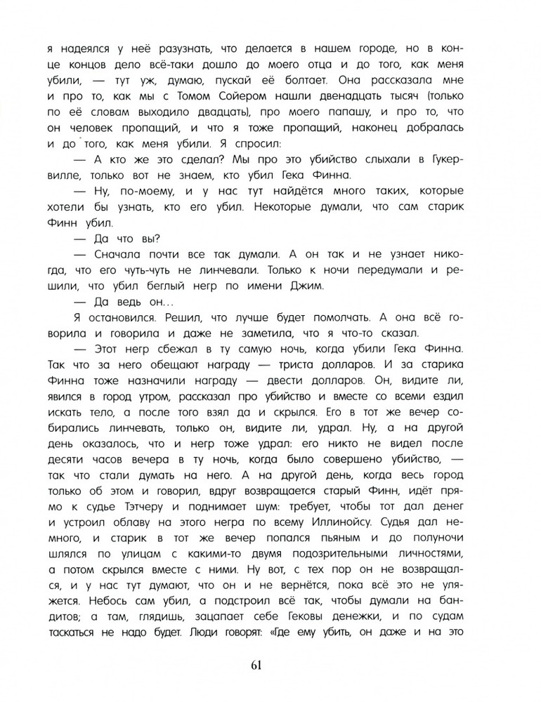 💳 Оплатить за товар можно при получении 🇰🇿 Есть бесплатная доставка по Казахстану от 1 дня 🎁 Копите бонусы с каждой покупки Серия: Детская художественная литература Мальчишка-бродяга Гек Финн и беглый раб Джим плывут на плоту по Миссисипи. Их путь лежит в соседние вольные штаты, где Джим обретет свободу. Они переживают опаснейшие приключения и встречают самых разных людей: бандитов и проповедников, мелких жуликов и линчевателей, плантаторов и авантюристов, — весь старый американский Юг проходит перед их глазами. Сатирические картины из жизни рабовладельческих штатов перемежаются лирическими описаниями великой реки, которая дарит двум странникам надежду и приют. |