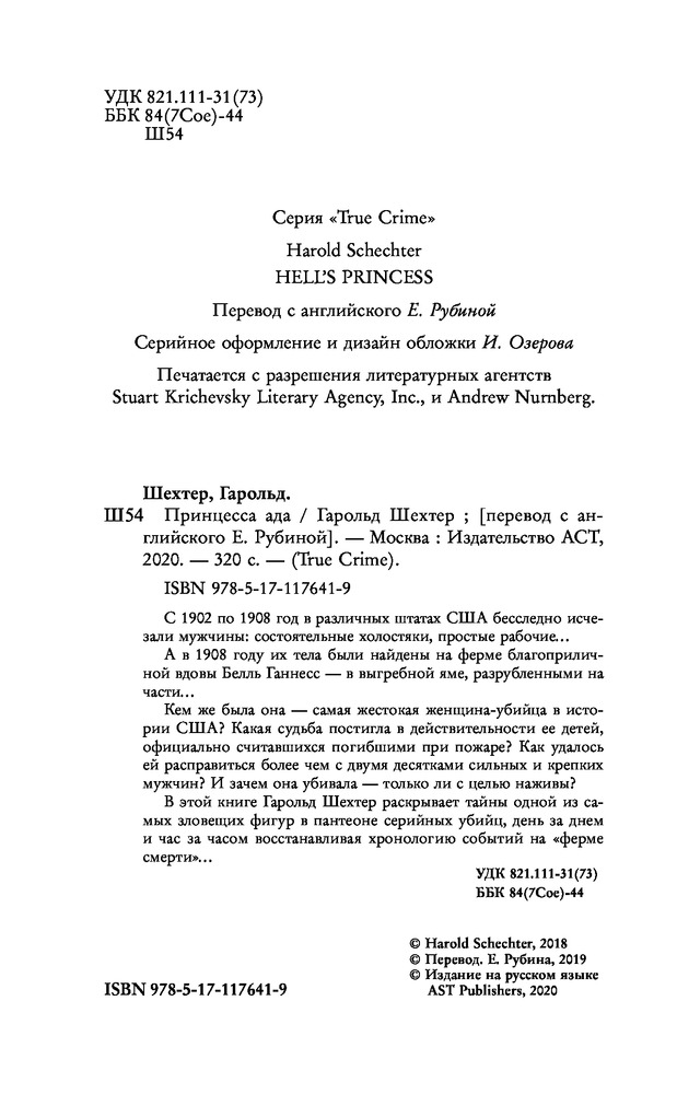 Серия: True Crime С 1902 по 1908 год в различных штатах США бесследно исчезали мужчины: состоятельные холостяки, простые рабочие... А в 1908 году их тела были найдены на ферме благоприличной вдовы Белль Ганнесс — в выгребной яме, разрубленными на части... Кем же была она — самая жестокая женщина-убийца в истории США? Какая судьба постигла в действительности ее детей, официально считавшихся погибшими при пожаре? Как удалось ей расправиться более чем с двумя десятками сильных и крепких мужчин? И зачем она убивала — только ли с целью наживы? В этой книге Гарольд Шехтер раскрывает тайны одной из самых зловещих фигур в пантеоне серийных убийц, день за днем и час за часом восстанавливая хронологию событий на «ферме смерти»... |