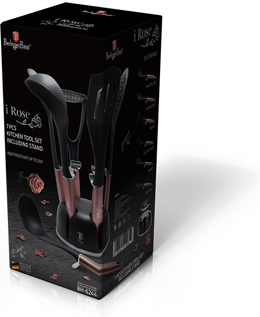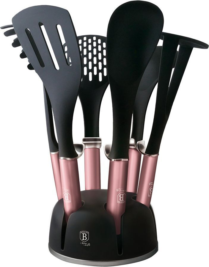 Berlinger Haus Набор кухонных инструментов «I-Rose Edition»В данный момент этот товар отсутствует в продаже. Возможно, у нас найдется аналогичный или похожий товар здесь. Серия: I-Rose Edition Набор кухонных принадлежностей — это универсальный и удобный аксессуар. Идеально подходит для мраморных, керамических и антипригарных поверхностей. Практичная подставка под все приборы, поворачивающаяся на 360 градусов. Вы можете ставить приборы на неё, не пачкая столешницу или плиту Нейлон удобен для вашей посуды, он никогда не поцарапает ее. У всех инструментов есть проушина, для того, что бы их можно было повесить на крючок. Дизайн данного набора отлично впишется в любую кухню, даже самую современную. Не содержит вредных веществ, таких как PFOA, свинца или кадмия. |