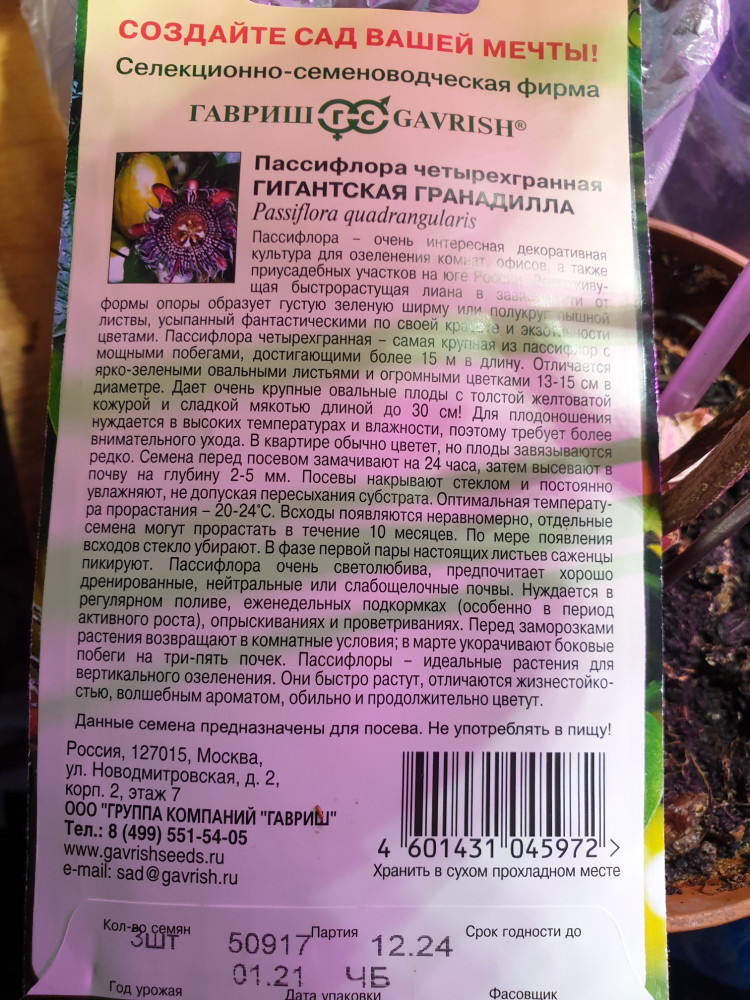 Гавриш Пассифлора четырехгранная «Гигантская гранадилла»+13 всходы количество семян не всходы несоответствие количества