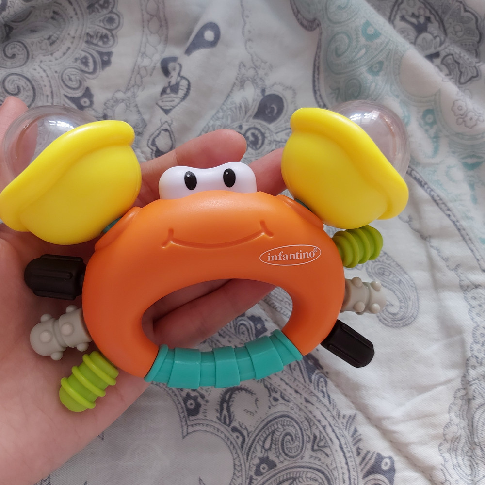 Краб отличный. Пластик хороший. Без запаха! Брала для 5 месячного малыша. На время заинтересовывает.