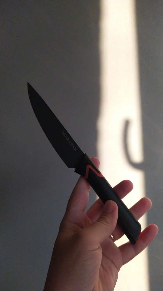 Хороший нож. Острое лезвие. Удобно держать в руке. Приобрела со скидкой довольна вдвойне.