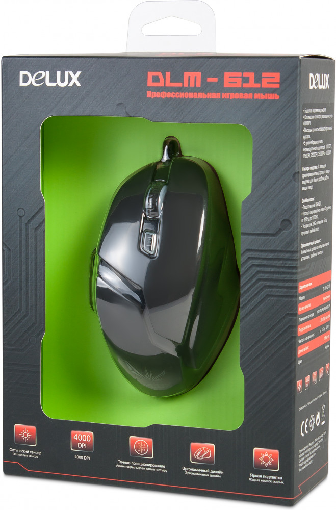 Delux Мышь игровая Delux DLM-612OUBВ данный момент этот товар отсутствует в продаже. Возможно, у нас найдется аналогичный или похожий товар здесь. Игровая, оптическая мышь, разработана специально для геймеров. Стильный, вызывающий дизайн корпуса и яркие цветовые решения в сочетании с современной оптикой, делают мышь лучшим выбором для игроманов. Встроенный контроллер Omron IC 4D от известного производителя полупроводниковых компонентов, гарантирует скорость сканирования поверхности и минимальный отклик, даёт преимущество в компьютерных играх, обеспечивает мгновенный ответ курсора на перемещение манипулятора. Оптический сенсор, с возможностью менять разрешение мыши в пределах 1000/1750/2500/3500/4000 dpi при помощи кнопки «DPI» около колёсика, позволяет придать курсору необходимую точность позиционирования. Каучуковое колесо прокрутки обеспечивает точность и не допускает скольжения пальца. Рельефные и прорезиненые вставки по бокам мыши позволяют более уверенно держать в руке и не дают ей выскользнуть из ладони. |