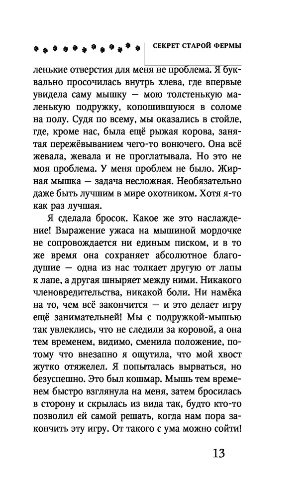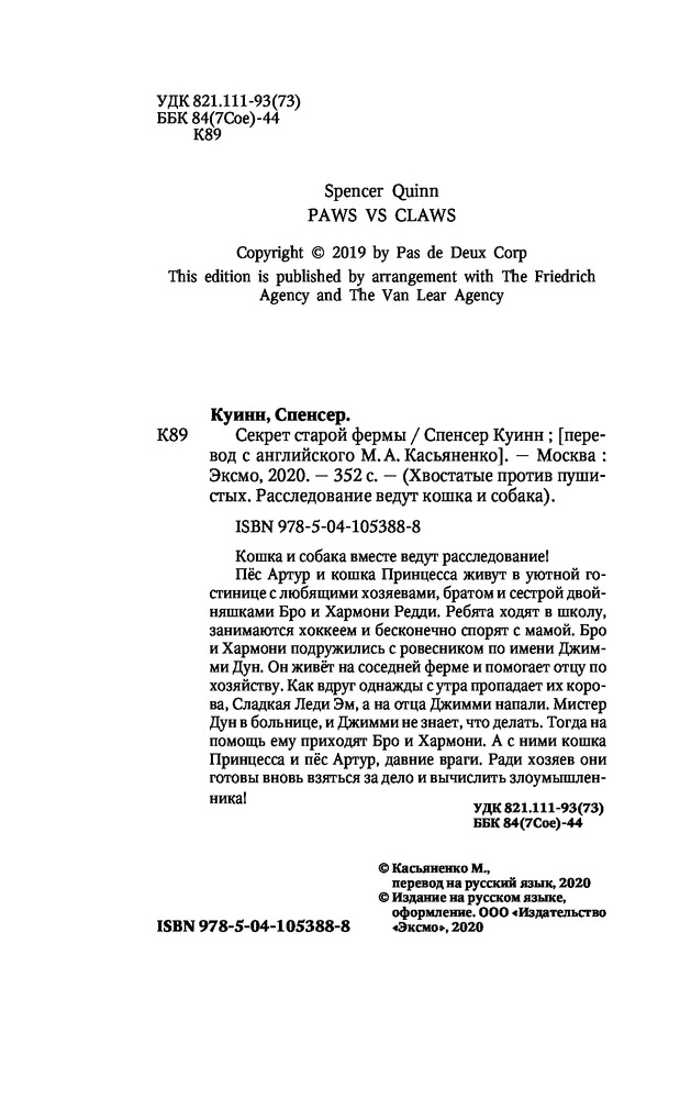 Серия: Детская. Хвостатые против пушистых. Расследование ведут кошка и собака Кошка и собака вместе ведут расследование! Пёс Артур и кошка Принцесса живут в уютной гостинице с любящими хозяевами, братом и сестрой двойняшками Бро и Хармони Редди. Ребята ходят в школу, занимаются хоккеем и бесконечно спорят с мамой. Бро и Хармони подружились с ровесником по имени Джимми Дун. Он живёт на соседней ферме и помогает отцу по хозяйству. Как вдруг однажды с утра пропадает их корова, Сладкая Леди Эм, а на отца Джимми напали. Мистер Дун в больнице, и Джимми не знает, что делать. Тогда на помощь ему приходят Бро и Хармони. А с ними кошка Принцесса и пёс Артур, давние враги. Ради хозяев они готовы вновь взяться за дело и вычислить злоумышленника! |