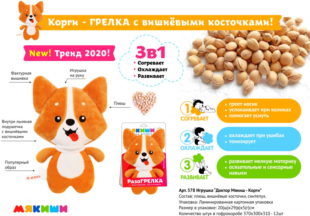 Если извлечь из Корги вишневые косточки, с ним можно играть, надев на руку. Придумывайте сказки и истории, ребенку это точно понравится! Плюшевый Корги, милая вышитая мордочка — все это будет способствовать сенсорному и эмоциональному развитию вашего малыша!