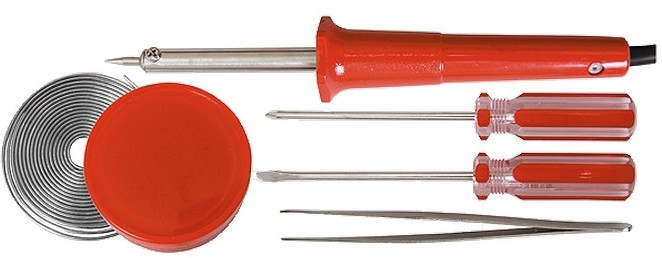 При проведении электромонтажных работ не обойтись без специализированного инструмента. Достоинство набора электрика — содержит необходимые принадлежности. Вы ничего не забудете, во время электромонтажных работ не окажетесь в ситуации, что под рукой не оказалось нужного приспособления. Продается в удобной сумочке для хранения и переноски. В комплекте: паяльник с пластиковой конусовидной ручкой, канифоль, припой диаметром 1 мм, пинцет и две отвертки, прямой шлиц.