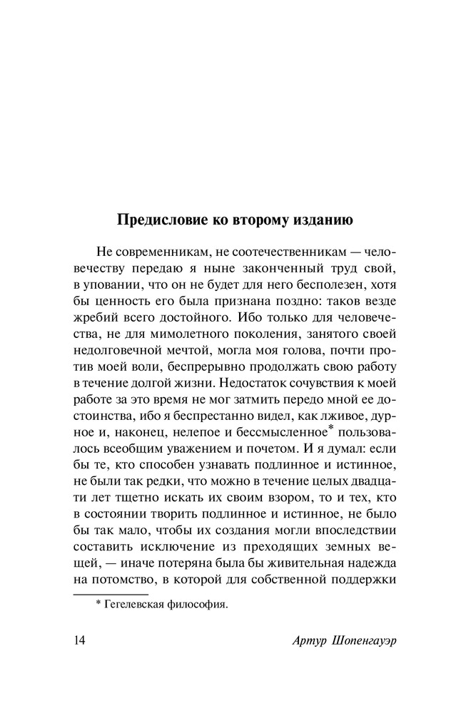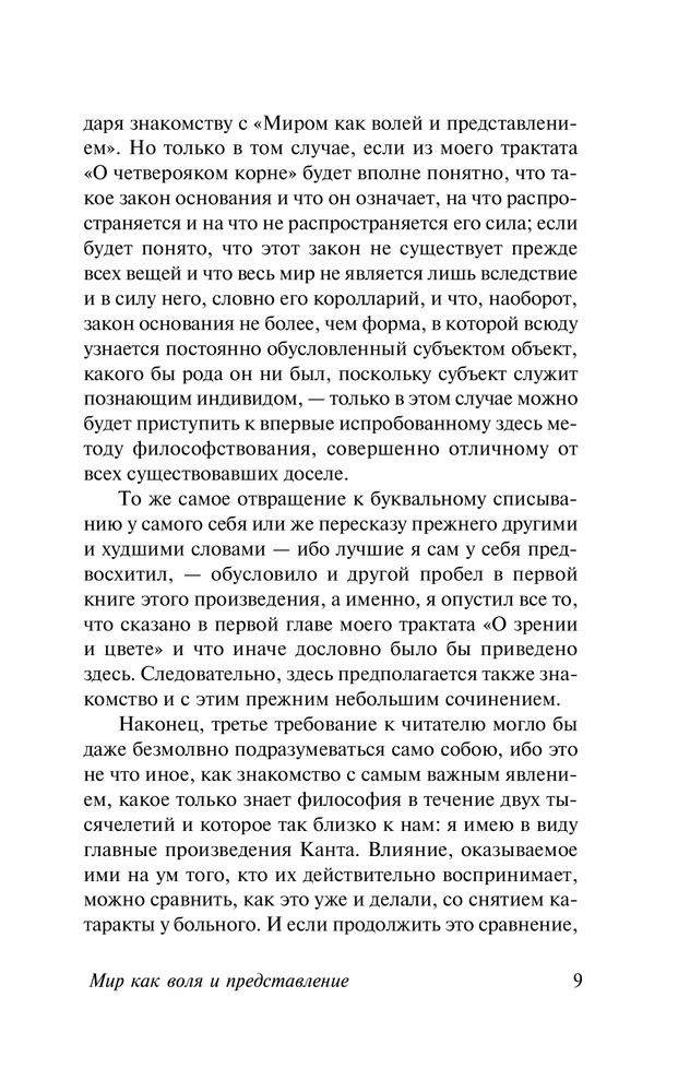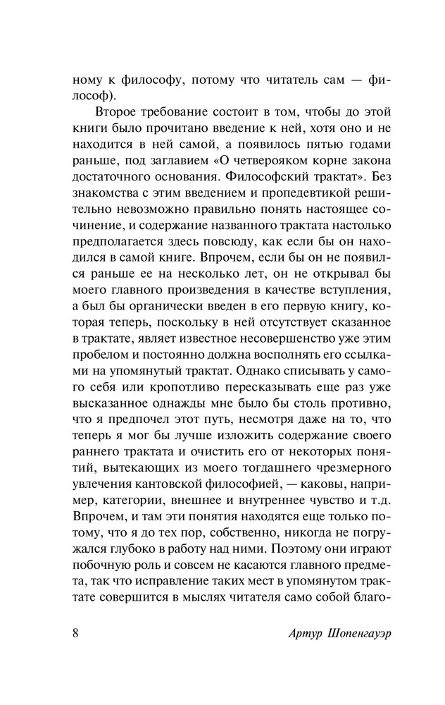 Перед прочтением ознакомьтесь с его довечним трактатом "О четверояком корне достаточного основания", это поможет легче понимать написанное. Также необходимо изучить труды Канта, т.к. тут он критикует(хотя скорее поправляет) его измышления