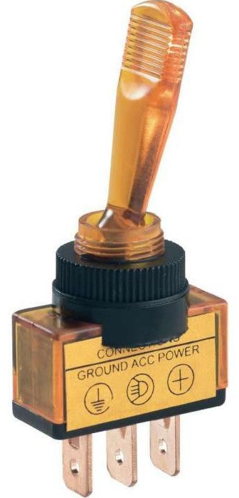 Однополюсный с подсветкой предназначен для коммутации электрических цепей напряжением 12 В. Такая разновидность переключателей применяется на лицевых панелях в качестве комплектующих изделий различного электрооборудования (в измерительных приборах, блоках питания, электроустановках на различных производствах, легковых и грузовых автомобилях, поездах и многих других местах). Отличительной особенностью тумблера является удлиненный (27 мм) пластмассовый перекидной переключатель, принцип действия которого основан на его перемещении в одну из позиций. Для переключения в нужное положение требуется приложить некоторые усилия. Монтаж осуществляется без применения винтов на плоских панелях толщиной от 0,8 мм до 4 мм. Подключение контактов осуществляется с помощью плоских клемм, либо с помощью пайки. Данный переключатель устанавливается на различные технические устройства, требующие высокой надежности в работе.