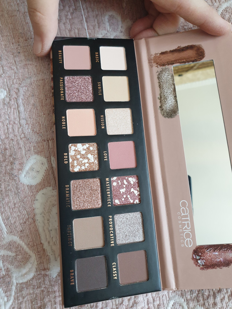 Пигментация супер, шиммерные оттенки невероятные, не очень поняла masterpiece и bold в них белые крупинки и розовая слюда, не сказать что в макияже это как то особо заметно, но выглядит в упаковке классно, отдельно хочу обратить ваше внимание на матовые оттенки-они не скатывается, приятные на ощупь, пигментация крутая, оттенок brave идеален для повседневных стрелок, дымчатых. Beauty и love можно использовать как румяна, оттенок vision как хайлайтер просто супер, но он немного рассыпчатый.Упаковка тоже классная. Палетка стоит вашего внимания. На фото хотелось передать сияние vision также сверху я добавила немного жидких блесток, но они особо роли там не сыграли, и вообще весь макияж глаз выполнен коричневым оттенками палетки.