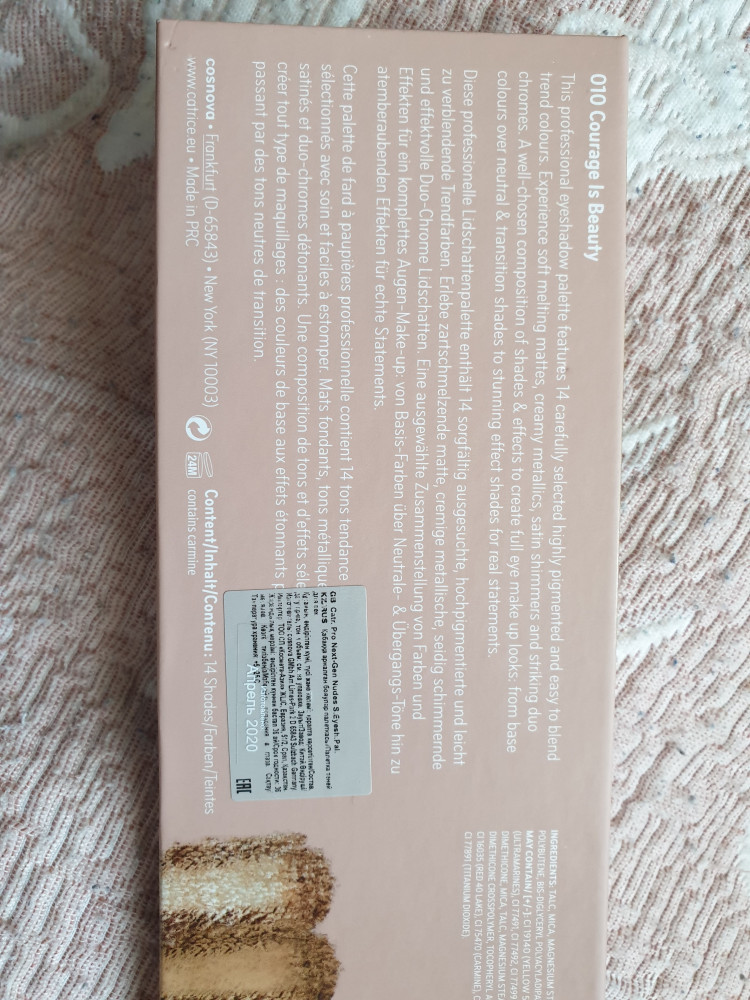 Дополняю отзыв, тени хорошие, на моих жирных веках продержалась 4 часа, но я не использовала базу для теней, по этому считаю результат хорошим т.к. другие тени сразу скатывались после 2 часов. Цвета насыщенные, о покупке ни чуть не пожалела. Единственное одну звезду сняла за то что не верно указали страну производителя, заявлено как Германия, а на самом деле Китай 😏😏😏, раздражения нет, аллергию не вызвали, но этот факт остаётся очень неприятным. Флип, обратите пожалуйста на это внимание.