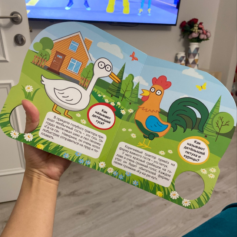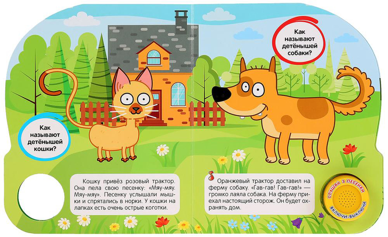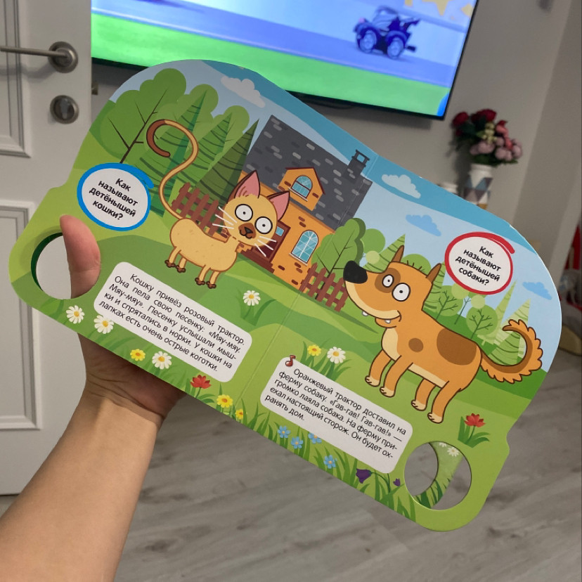 Книжка яркая, страницы картонные прочные. Ребёнок с ней не расстается, играет, как с игрушкой "синий трактор". К качеству претензий нет. Звук тоже очень хороший. Из минусов: вместо заявленных трех песен, всего одна. Это даже не три куплета, а 1,5, подделенные на три части : 1) по полям... му му 2)а ну, малыш, давай.. хрю хрю 3)а ну, малыш, давай.. гав гав. И из картинок, к огромному сожалению, трактор только на обложке =((( На разворотах только разные животные. Так что даже не знаю, порекомендовала бы или нет) но ребёнок счастлив, это главное.