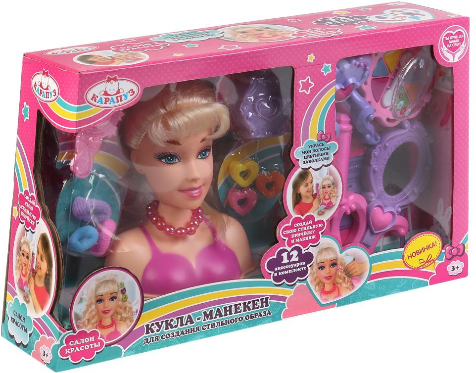 Кукла-манекен ТМ «Карапуз» для создания стильного образа - представляет собой кукольную голову из мягкого материала с длинными светлыми волосами. Кукольное лицо детально проработано. С помощью этого набора можно открыть свой салон красоты: укладывать волосы, украшать цветными заколками, создавать стильные причёски и создавать стильный макияж. Волосы куклы-манекена можно мыть, как в настоящей парикмахерской. Все аксессуары малышка сможет использовать также и для своей причёски.