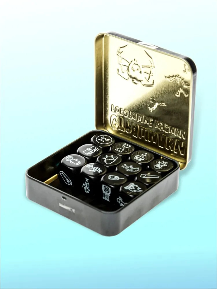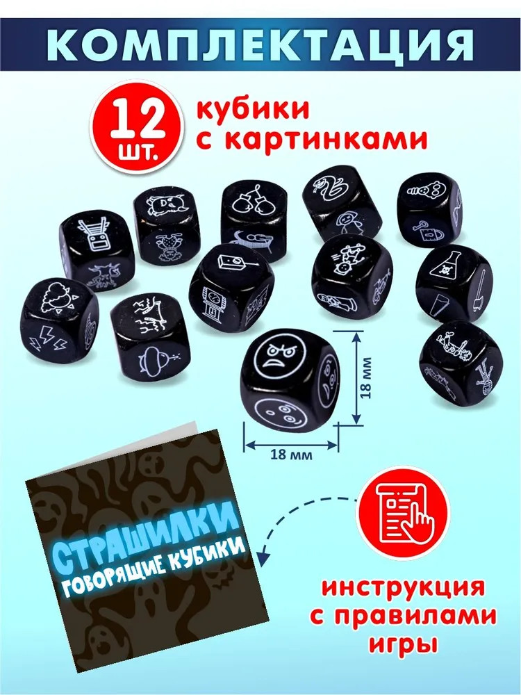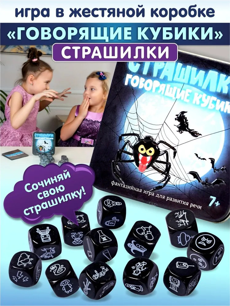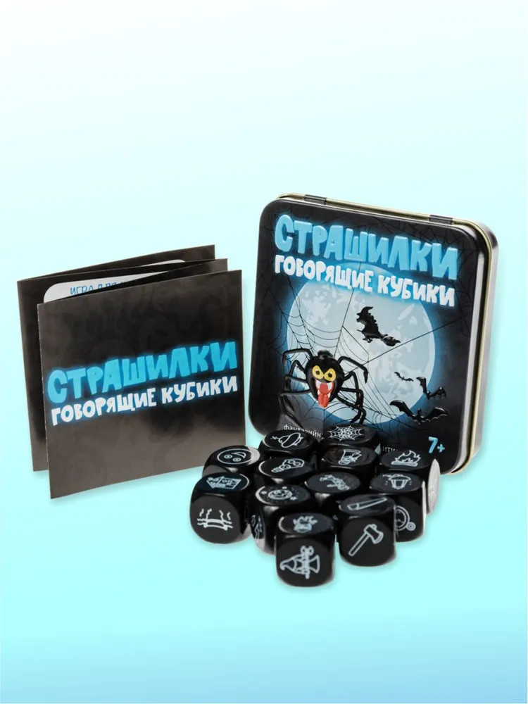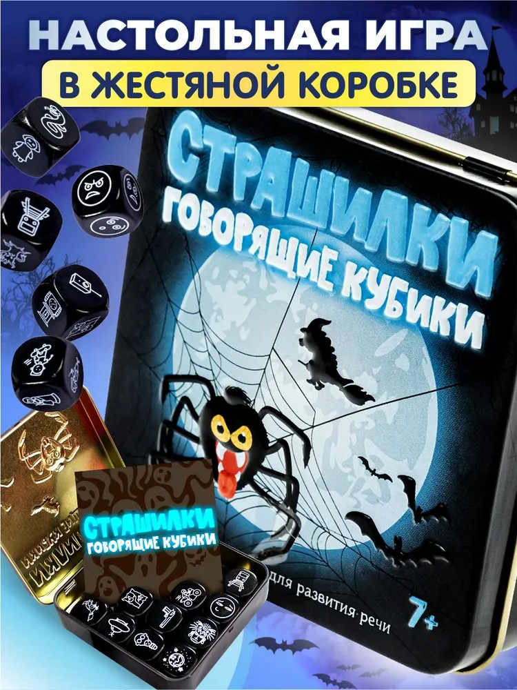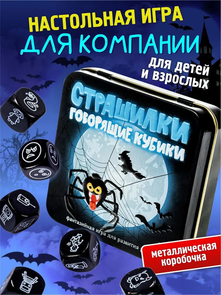 Настольная игра «Говорящие кубики Страшилки» позволит детям не только услышать новую страшную историю, но и даст им возможность сочинить историю самим. Приглушённый свет в комнате и кубики чёрного цвета придадут истории подобающий антураж.