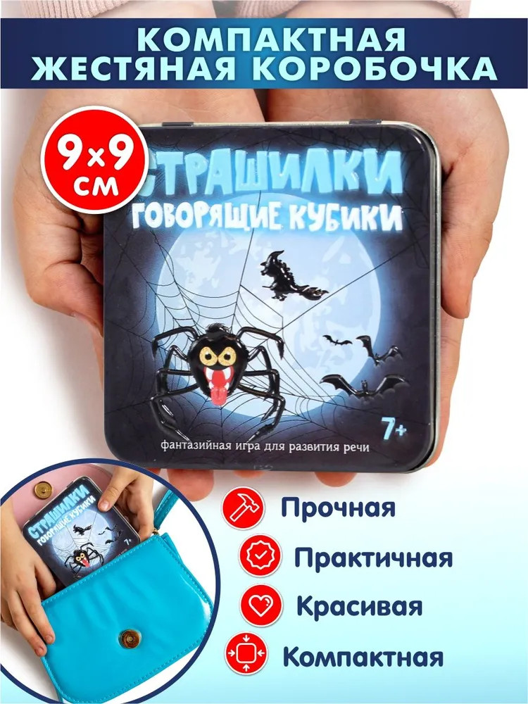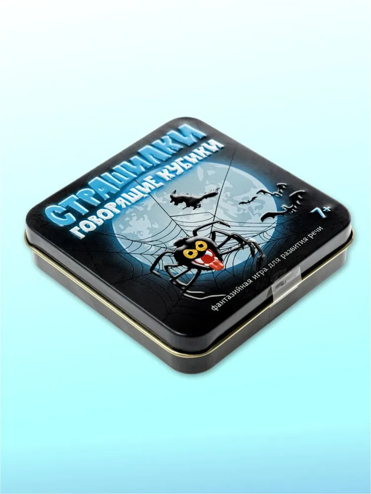 Настольная игра в жестяной коробочке «Говорящие кубики Страшилки» способствует развитию фантазии, воображения, логического мышления, памяти и речи, а также обучает навыку последовательно рассказывать свою историю. |