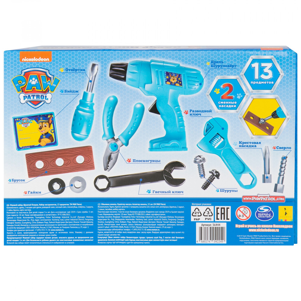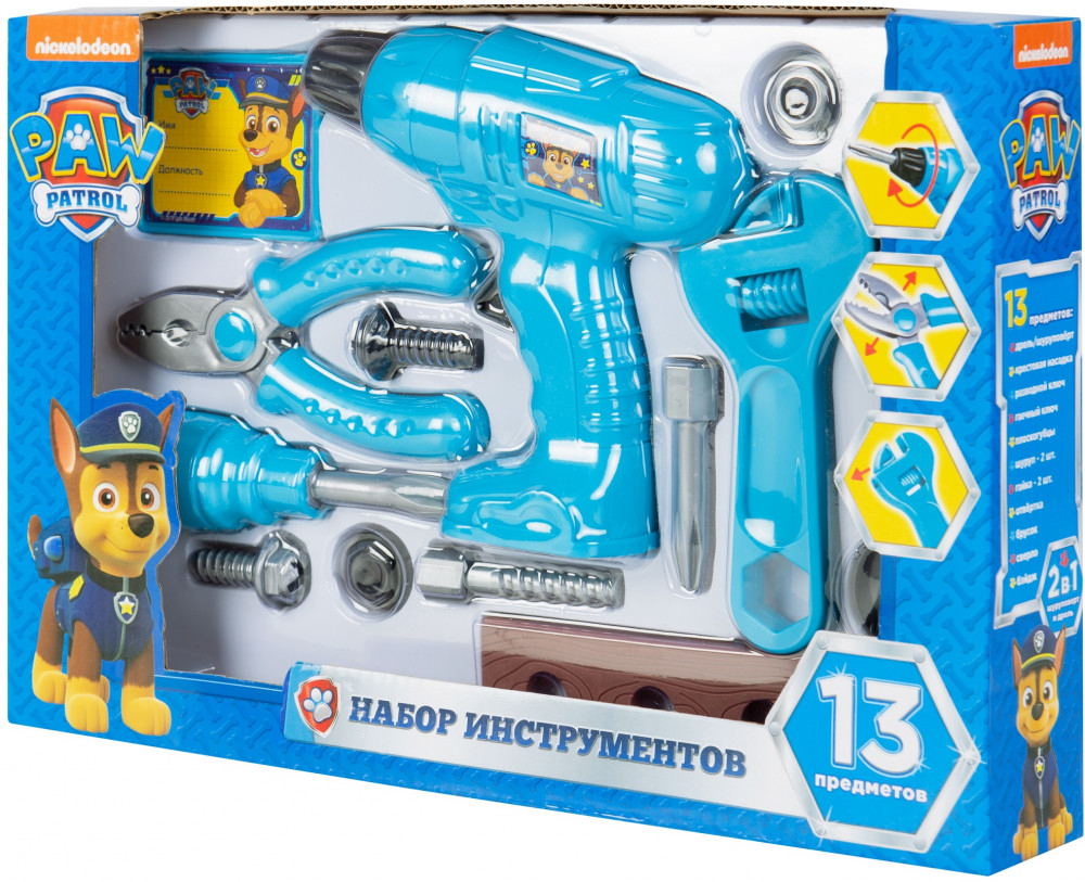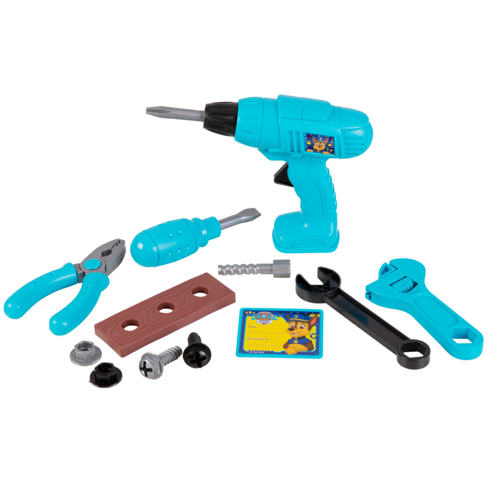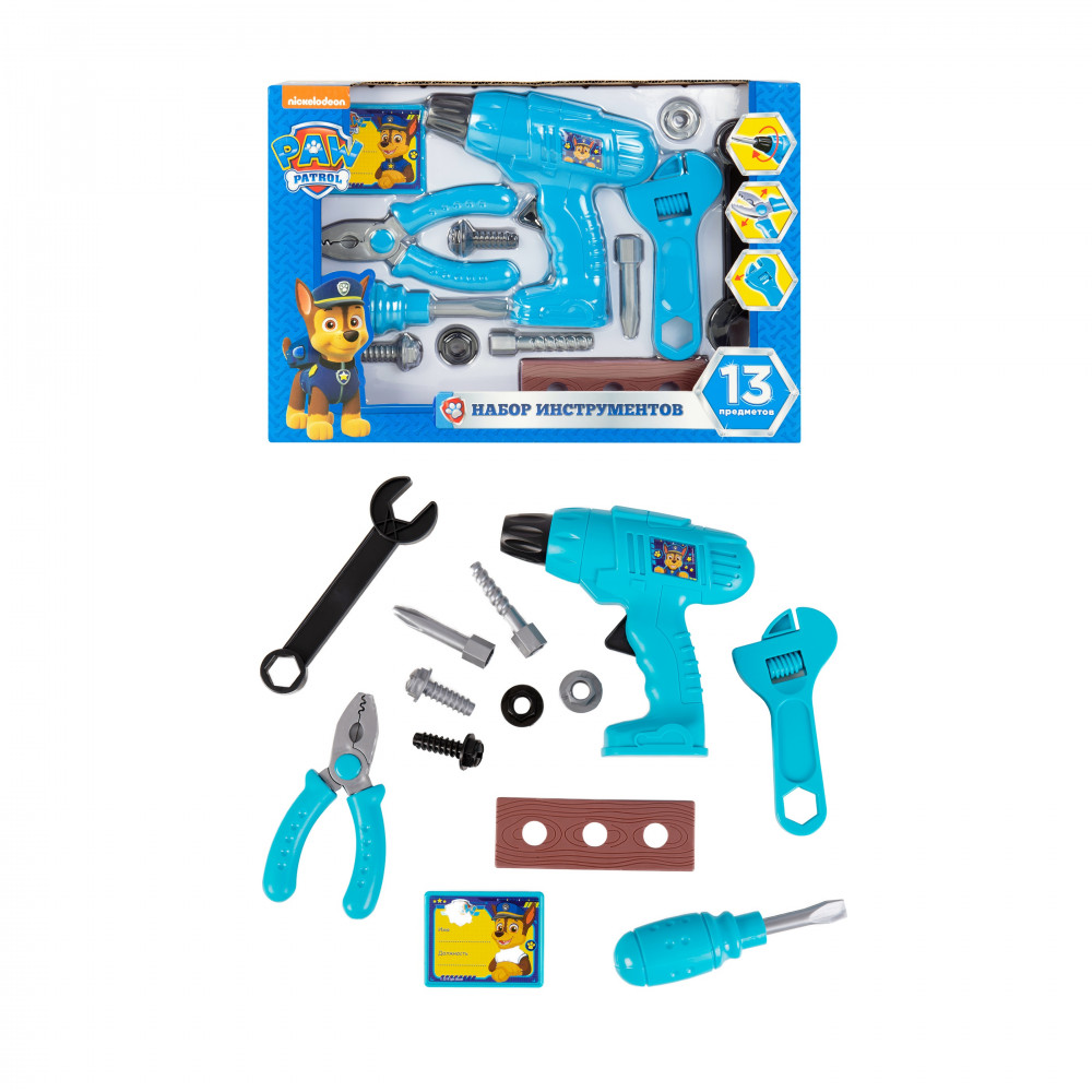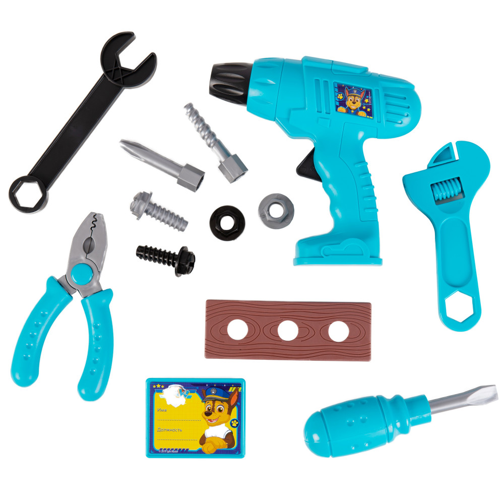 Подарите своему юному мастеру набор инструментов с героями мультфильма «Щенячий патруль» ! Играя с набором, ребенок узнает название инструментов и способы их применения. При нажатии кнопки приходит в движение наконечник дрели, работает без батареек.