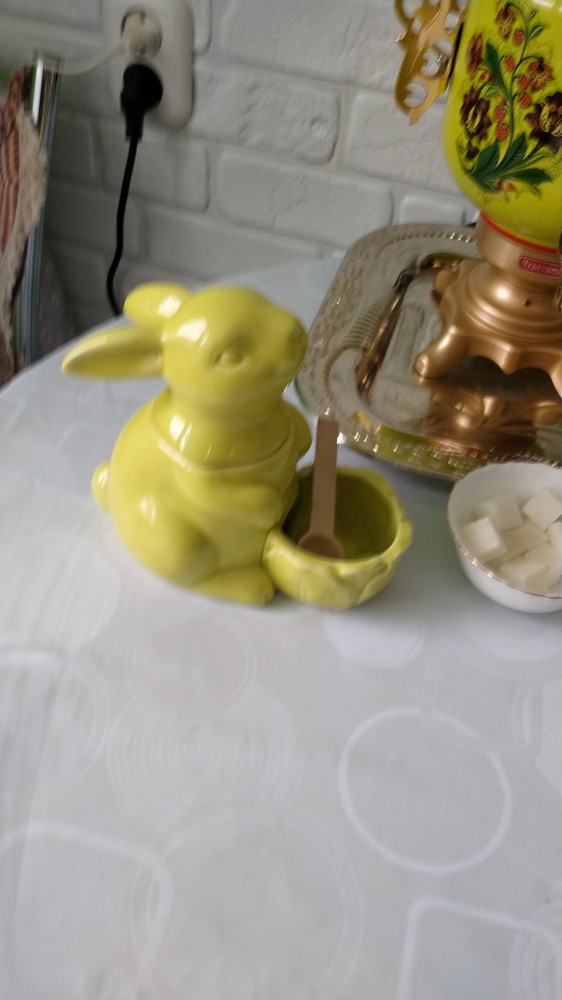 Очень красивая и стильная вещица. Даже несмотря на необычный цвет, прекрасно смотрится в интерьере. В пояснении к товару было написано, что это для соли, но я насыпала сахар и прекрасно смотрится на столе, и прикупила керамический чайничек с подогревом, получилась композиция
