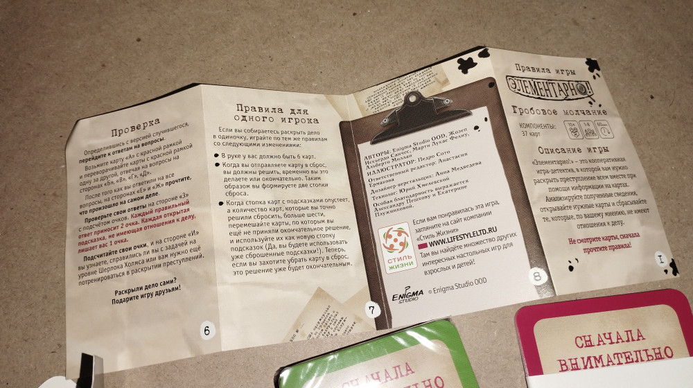 Стиль Жизни Игра настольная «Элементарно! Гробовое молчание»В данный момент этот товар отсутствует в продаже. Возможно, у нас найдется аналогичный или похожий товар здесь. «Элементарно!» — это кооперативная игра-детектив, в которой вам нужно раскрыть преступление всем вместе при помощи информации на картах. Анализируйте полученные сведения, открывайте нужные карты и сбрасывайте те, которые, по вашему мнению, не имеют отношения к делу. |