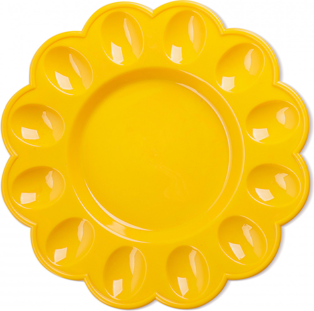 Лёгкая, тонкая, но устойчивая яркая тарелочка. Углубления для 12 яиц неглубокие, аккуратные. Под куличом и крашенками она будет почти полностью закрыта, но я думаю, что свою функцию выполнит. Покупкой довольна. Спасибо!