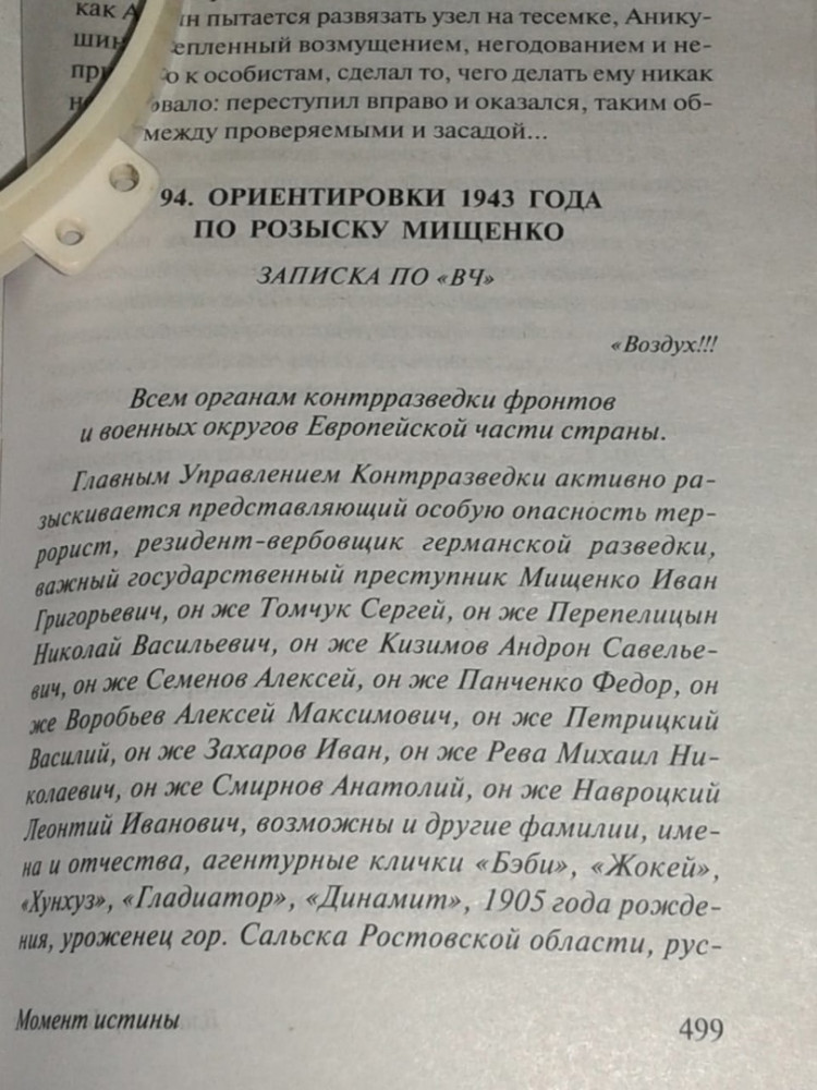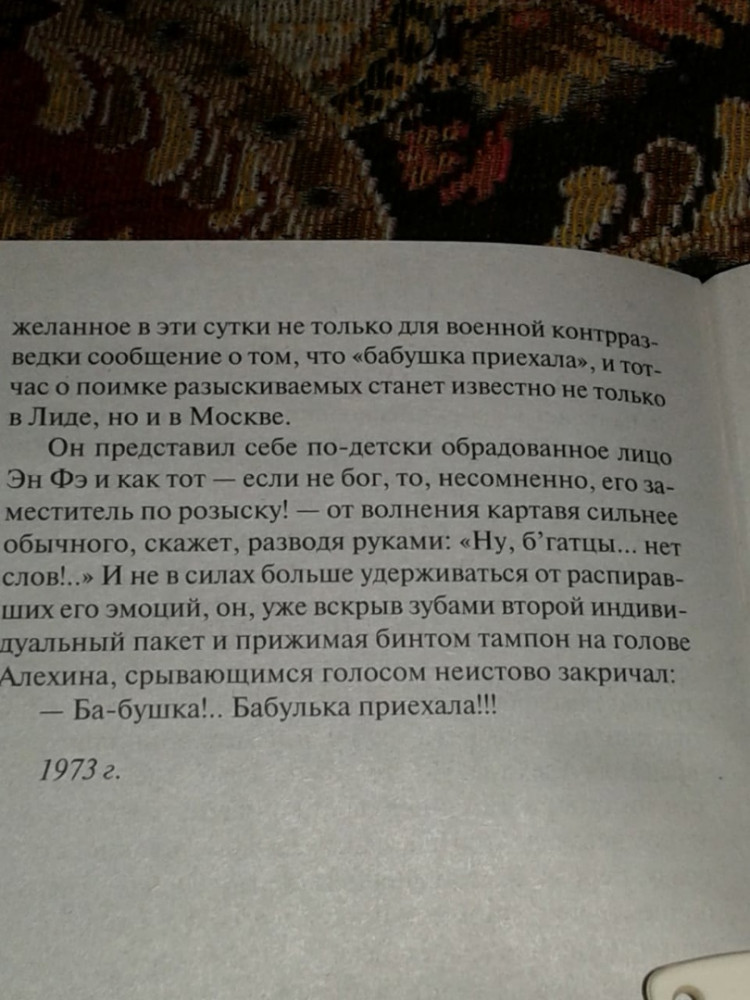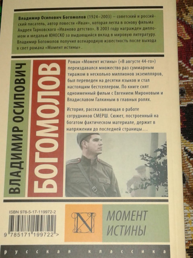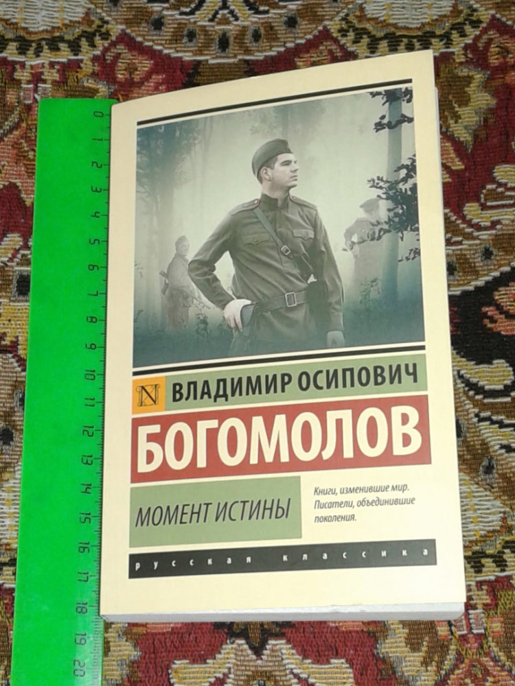 Роман "Момент истины"- потрясающе интересная книга о работе советских контрразведчиков во время Великой Отечественной войны.Переиздавался миллионными тиражами, переведен на много иностранных языков.Автор - В.О.Богомолов ,бывший офицер ГРУ Генштаба,рассказывает об одном из эпизодов секретной работы контрразведчиков по выявлению и захвату легендарного гитлеровского диверсанта- людоеда Грищенко и его группы. Известно,что Андропов, Председатель КГБ СССР,обращался к автору с просьбой подарить ему экземпляр романа с дарственной надписью. В Советском Союзе купить эту книгу было почти невозможно, ее расхватывали моментально.Иметь "Момент истины"в своей домашней библиотеке - редкостная удача! Издана в издательстве "АСТ" Москва. Качество бумаги, обложка, шрифт меня вполне устраивают.Спасибо "Флип.КЗ"за возможность приобрести эту книгу!