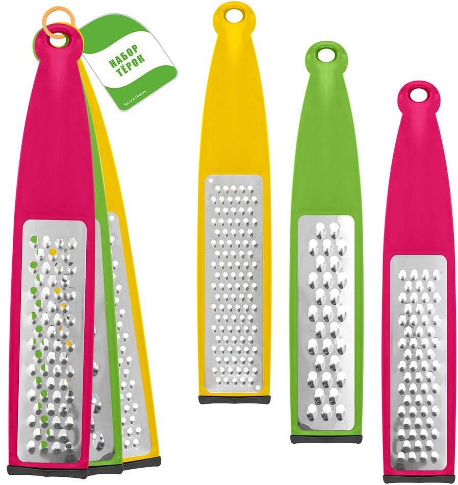 Набором довольна. И разные срезы, и удобно хранить, использовать, компактные тёрки. Цвета зелёный, розовый и фиолетовый.